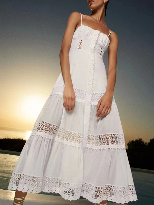 Loose Sleeveless Hollow Solid Color Split-Joint Spaghetti-Neck Midi Dresses
