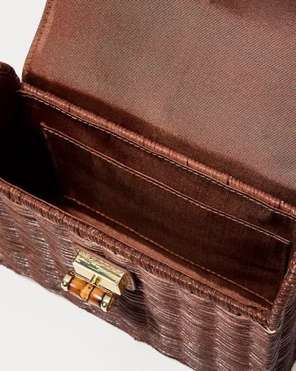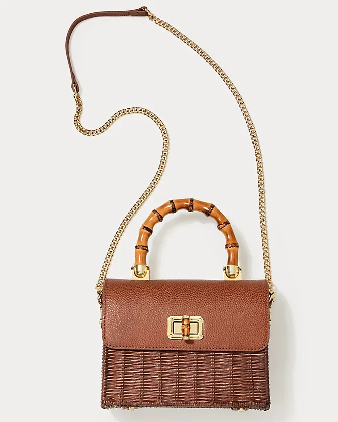 Wicker bag with a natural bamboo top handle, turnlock closure, and detachable gold metal chain crossbody strap.