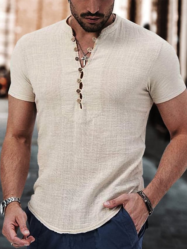 Gender:Men's,Style:Comfortable,Fashion,Occasion:Streetwear,Casual,Daily,Holiday,Vacation,Tops Type:Summer Shirt,Linen Shirt,Casual Shirt,Henley Shirt,Neckline:V Neck,Fabric:Cotton And Linen,Sleeve Length:Short Sleeve,Elasticity:Micro-elastic,Look After Me:Wet and Dry Cleaning,Washable,Pattern:Plain,Season:Summer,Bust (cm):M:112;L:118;XL:124;2XL:132;3XL:140,Sleeve (cm):M:25;L:25.5;XL:26;2XL:26.5;3XL:27,Shoulder Width (cm):M:47;L:48;XL:50;2XL:52;3XL:54,