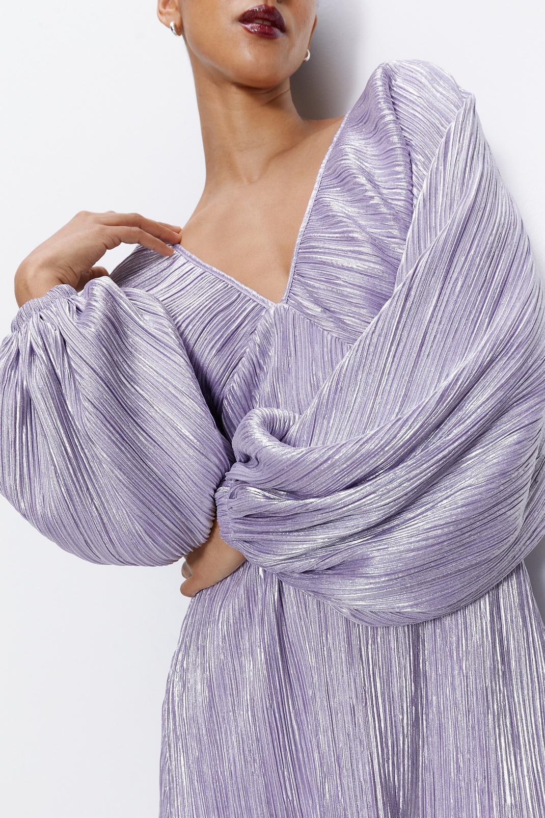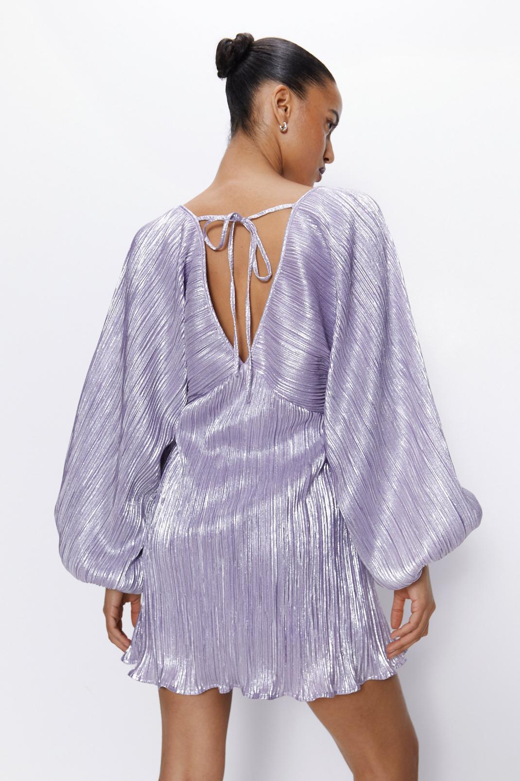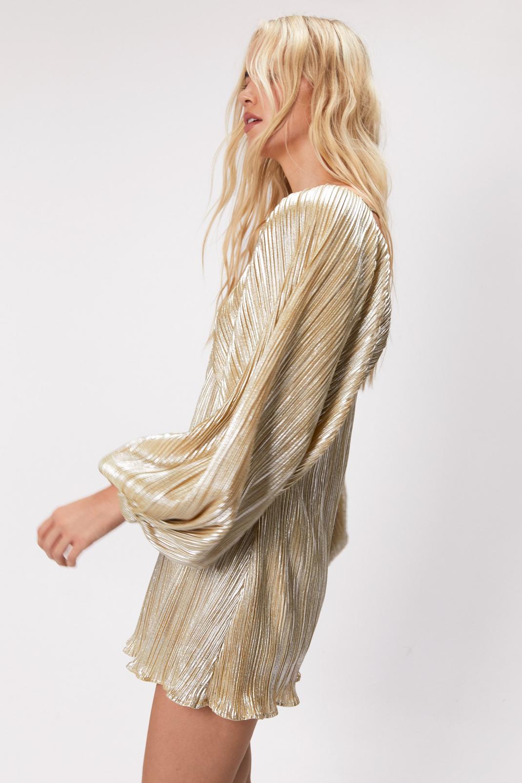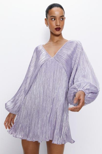 Metallic Pleated Balloon Sleeve Mini Dress