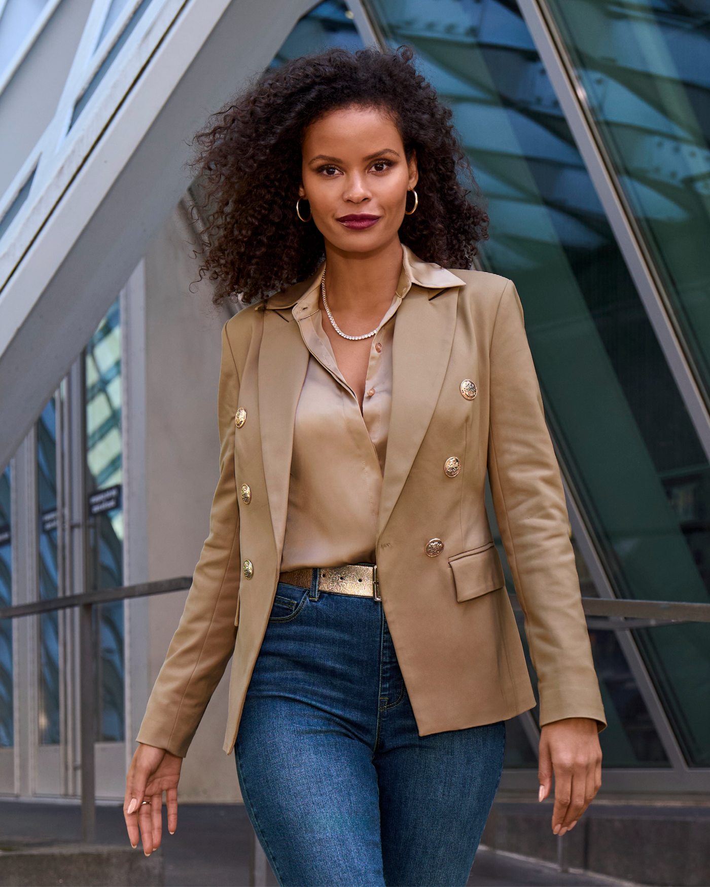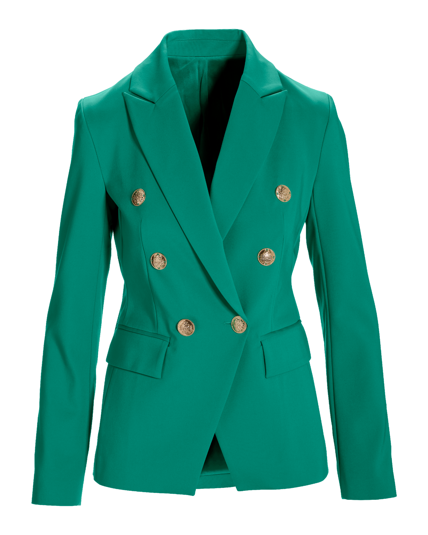 Channel contemporary sophistication in the Modern Double-Breasted Blazer. Designed with a flattering tailored fit, striking gold-tone buttons, and classic notched lapels, this vibrant jacket effortlessly transitions from chic casual pairings to refined business looks, making it a versatile staple for every stylish occasion.