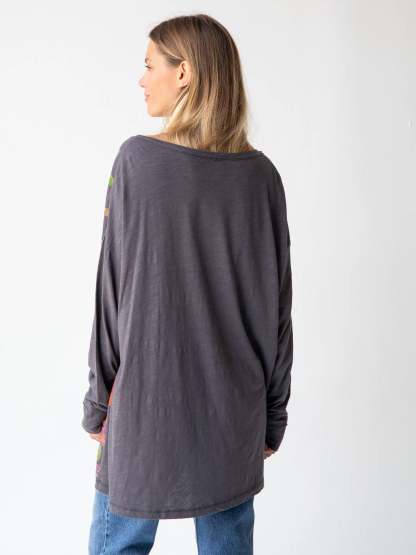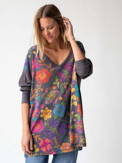 One Size Cotton Long Sleeve Easy V-Neck Tee - Charcoal Floral
