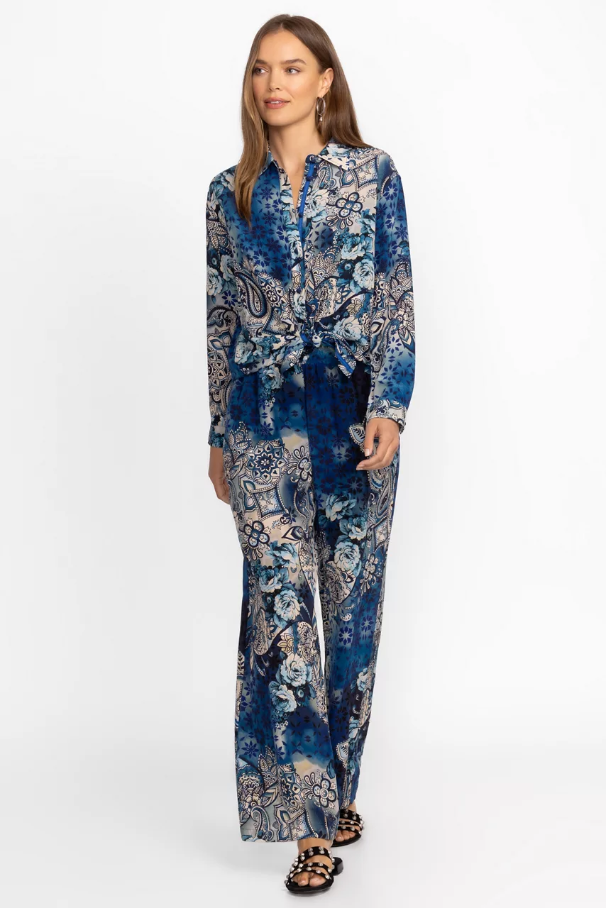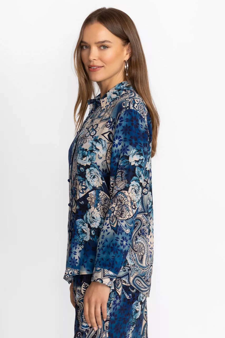 Crafted from 100% sumptuous silk, the Oversized Pleat Shirt offers an updated take on classic shirting. Featuring a traditional button-front and cuffed sleeves, this shirt is embellished with a bold floral pattern in hues of blue and is finished with fabric covered buttons. Pair with navy trousers and pumps for a polished workday look.