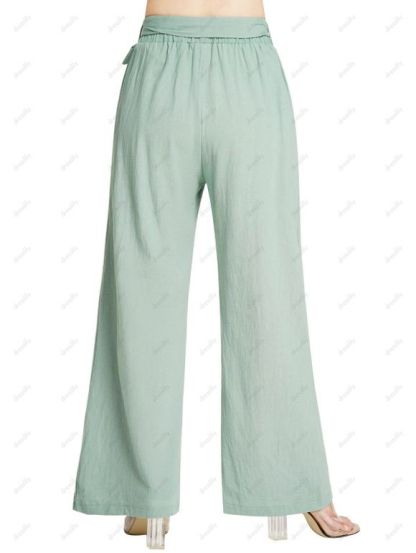 Pastel Color Pants Mock Button Belted Elastic High Waisted Wide Leg Long Pants