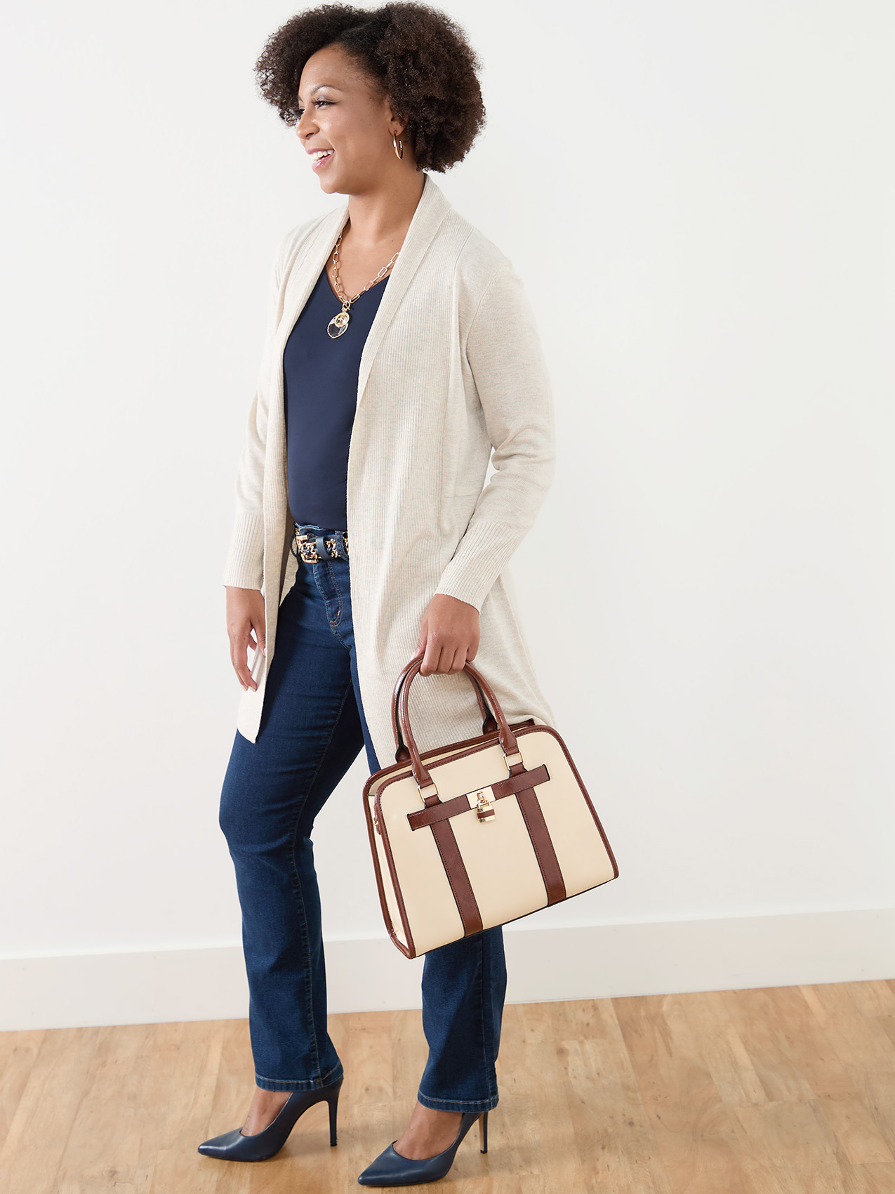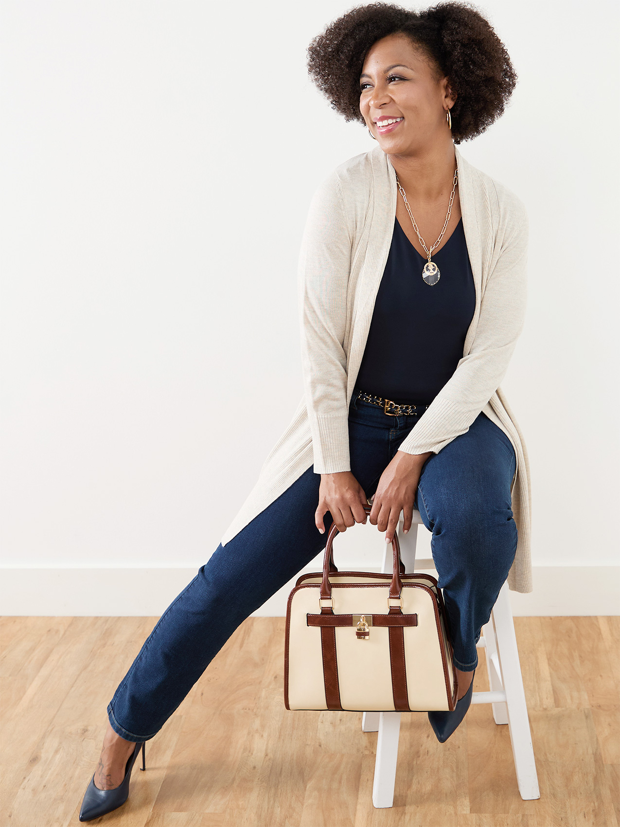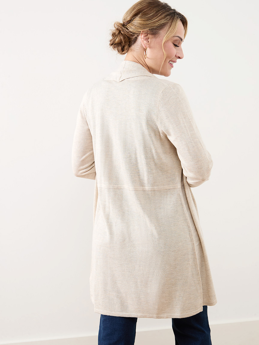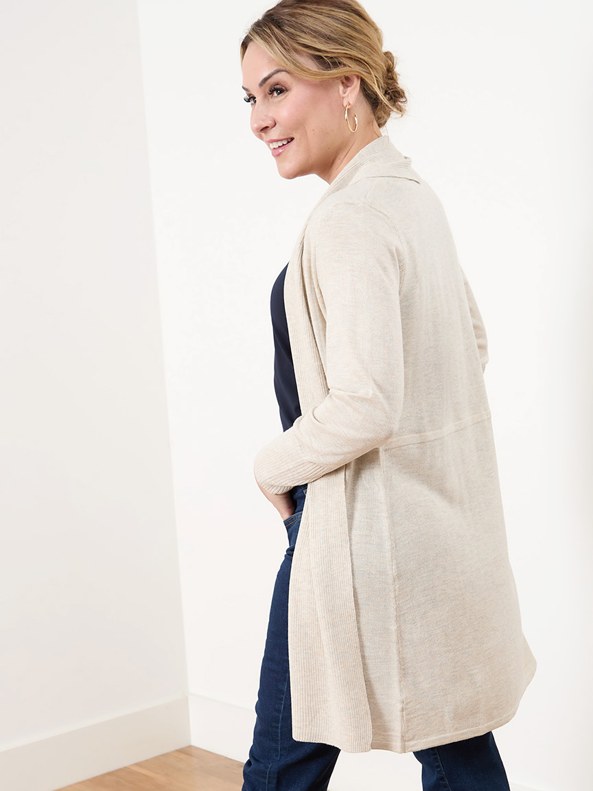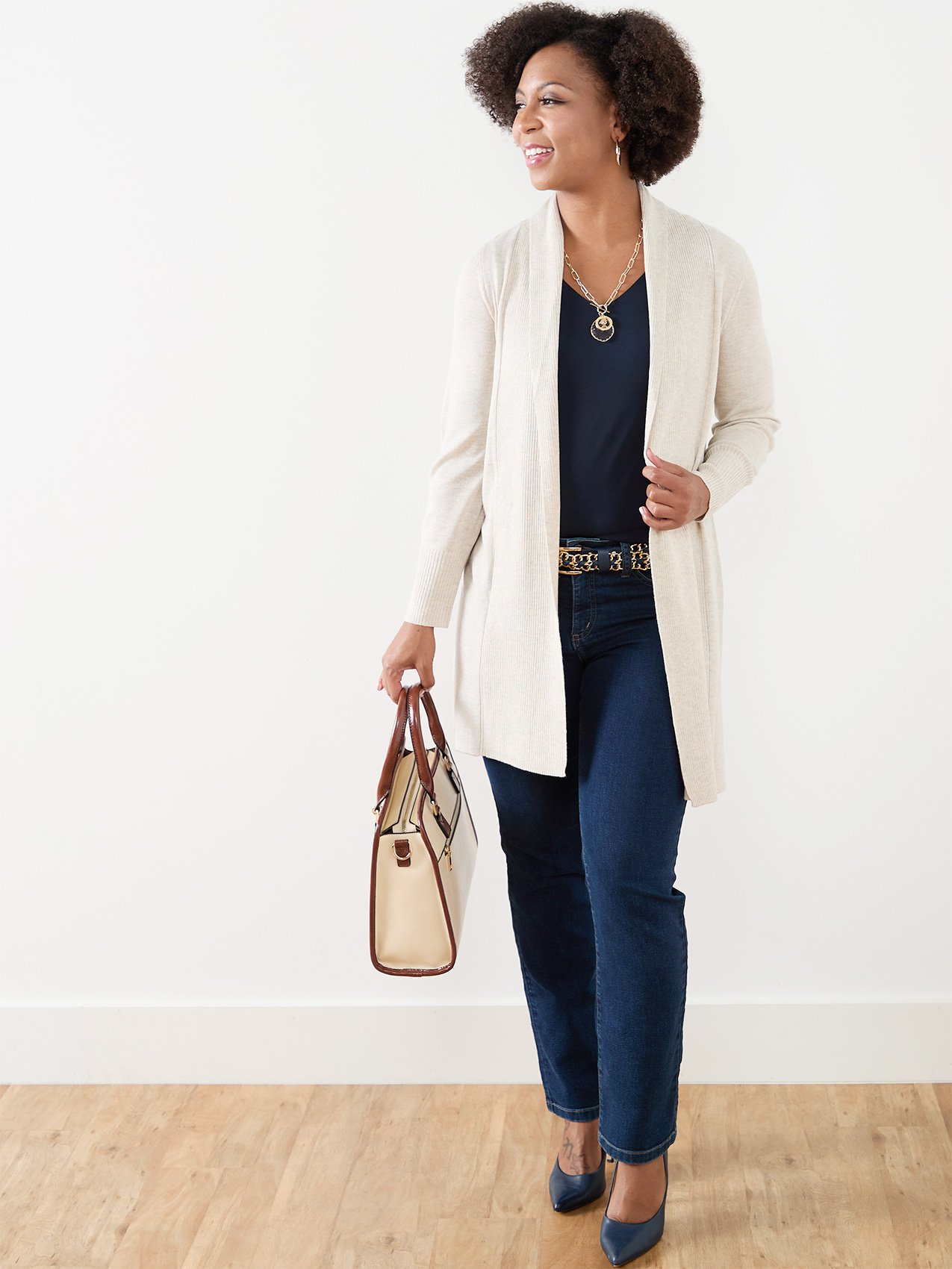 An easy open front cardigan you can throw on over anything for a little extra warmth. It comes in a longer length for added coverage at the home or office.