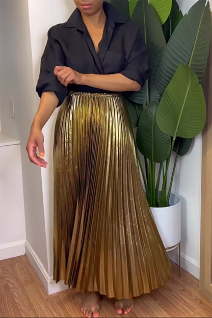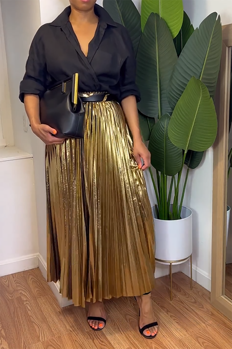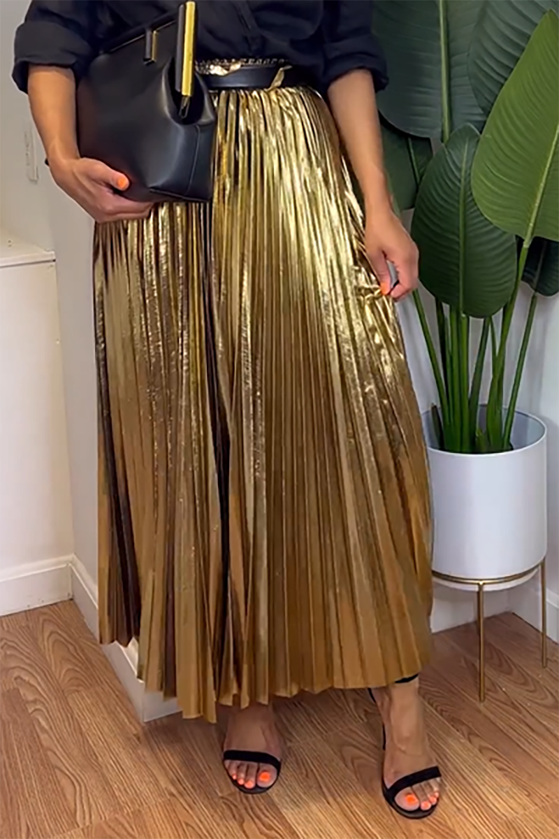 Plus Size Gold Daily Pleated Metallic Skirts [Pre-Order]