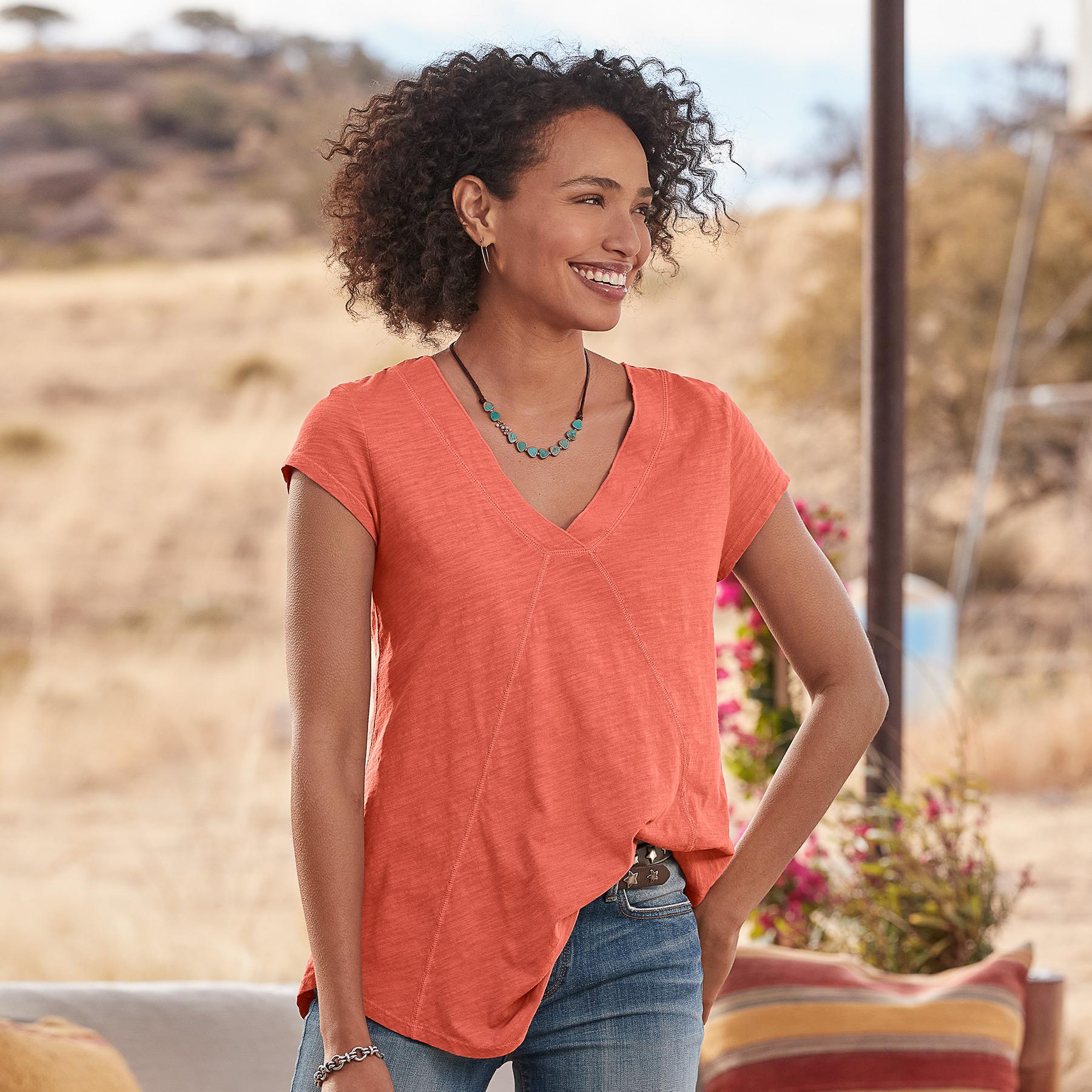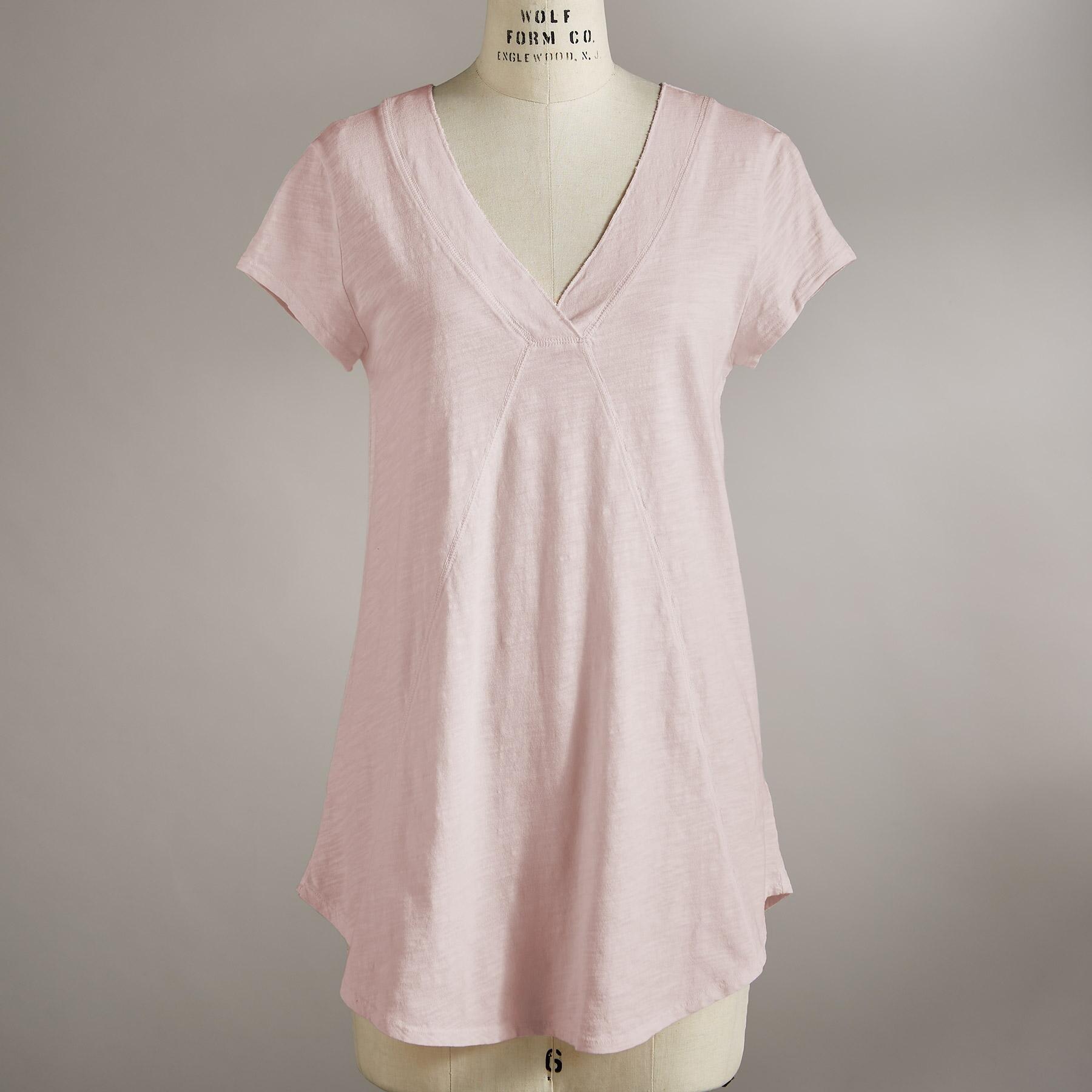Comfy every day, this tee boasts subtle, directional seaming that flatters. V-neck and rounded, hi-lo hem. Cotton slub. Machine wash. Imported. Sizes XS (0-2), S (4-6), M (8-10), L (12-14), XL (16-18), XXL (20-22). Approx. 29.75"l.