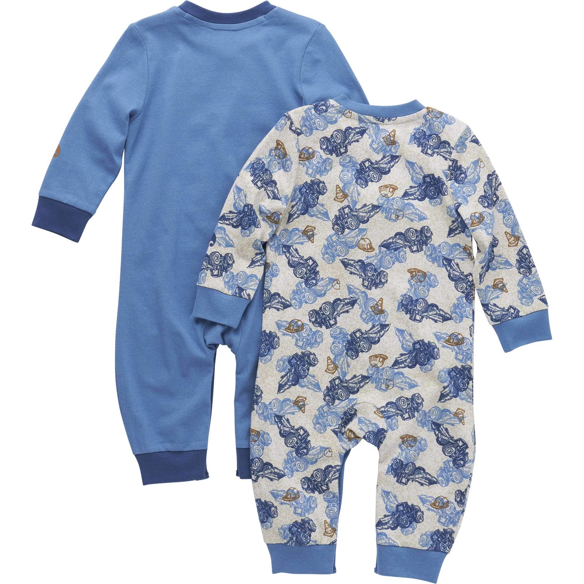 Gear him up for adventure in these baby boys' coveralls. When one gets dirty, you've got a backup set. Both of them have snaps for easy on and off. Both have knee patches, so he can spend hours in the sandbox. Both of them have construction graphics and a Carhartt logo. Double coverall win.