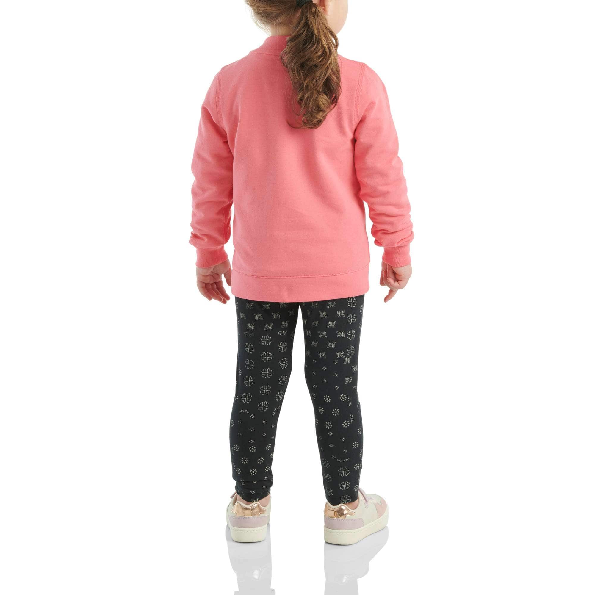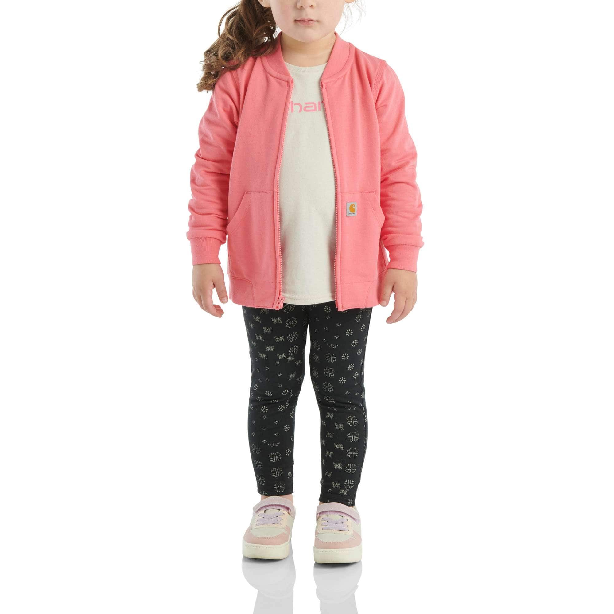 Plush comfort for her. Strong durability for you. This toddler girls' three-piece outfit gives her all the Carhartt goods. A soft cotton tee pairs up perfectly with a French terry jacket. Add the stretchy jersey leggings with a bandanna print, and it's adventure time.
