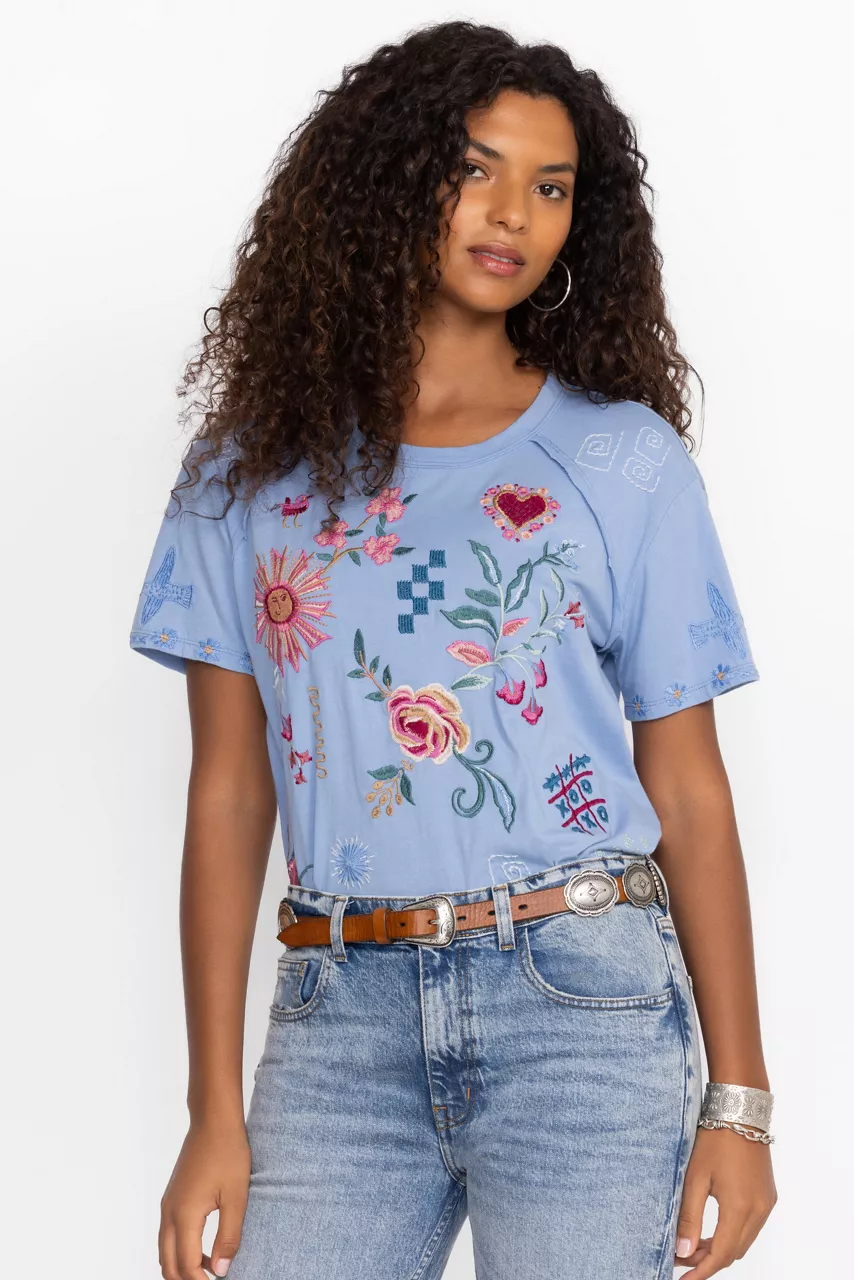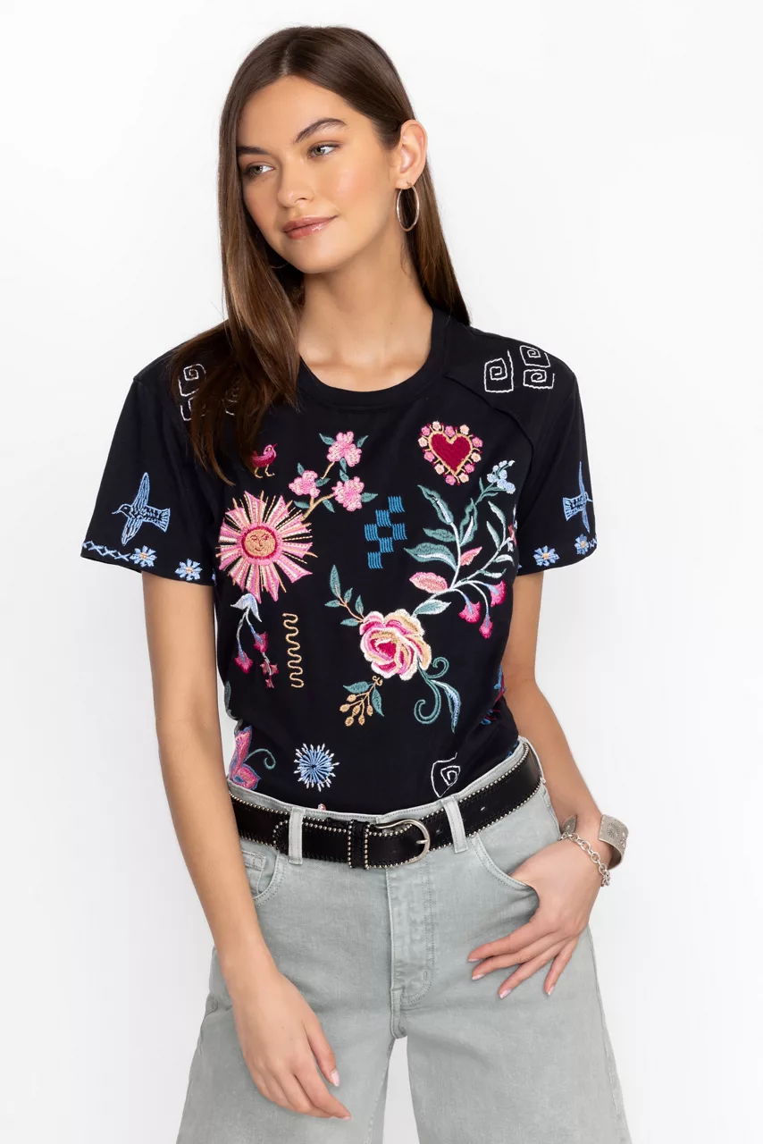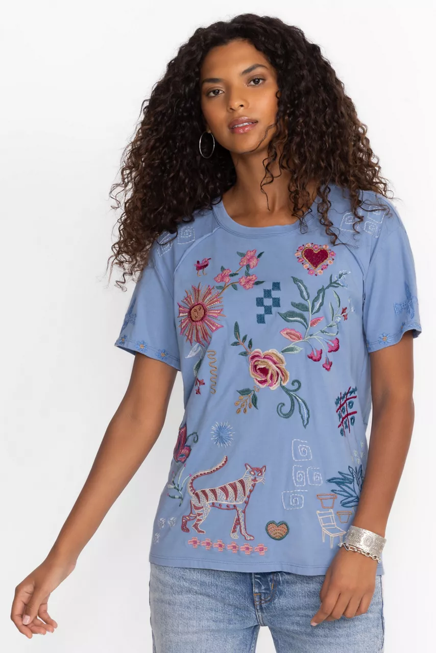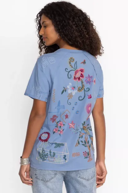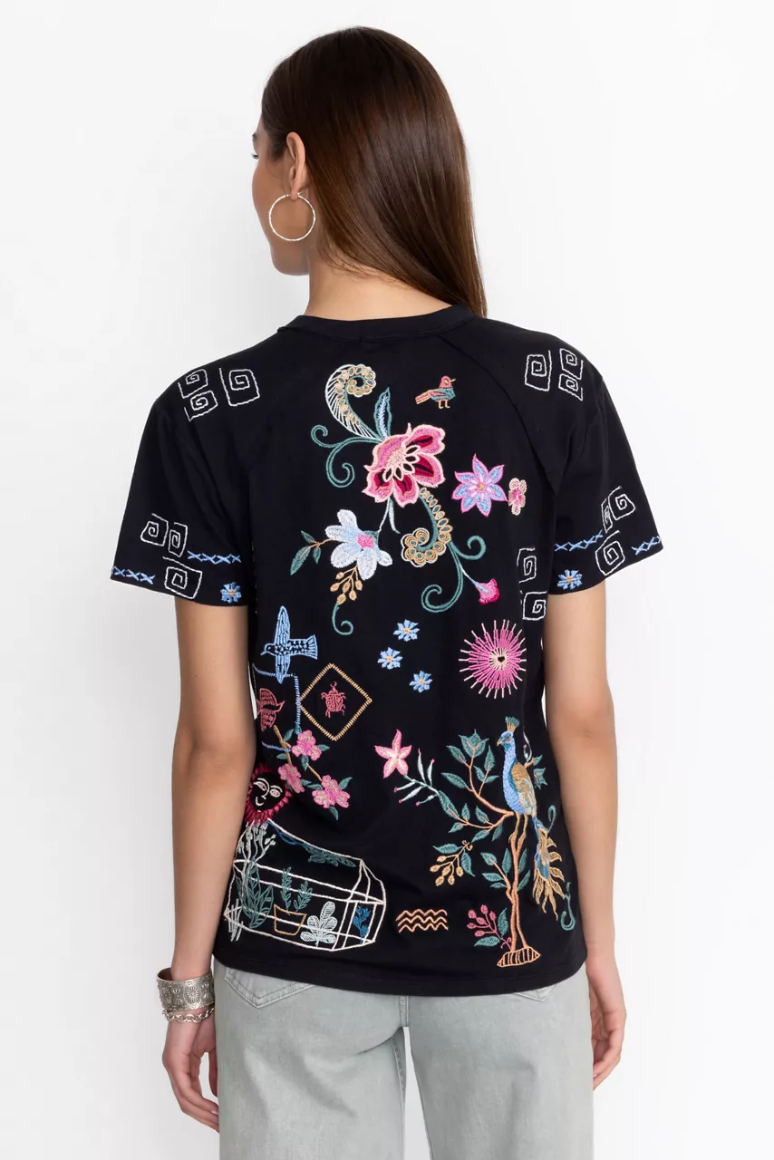 Elevating a classic tee to the next level, the Carmene Raw Detail Raglan Tee is embellished with intricately embroidered flora and fauna. Crafted from 100% breathable cotton, this tee features a crew neckline and relaxed fit raglan sleeves. Fair with a denim skirt and fashion sneakers for a fresh casual look.