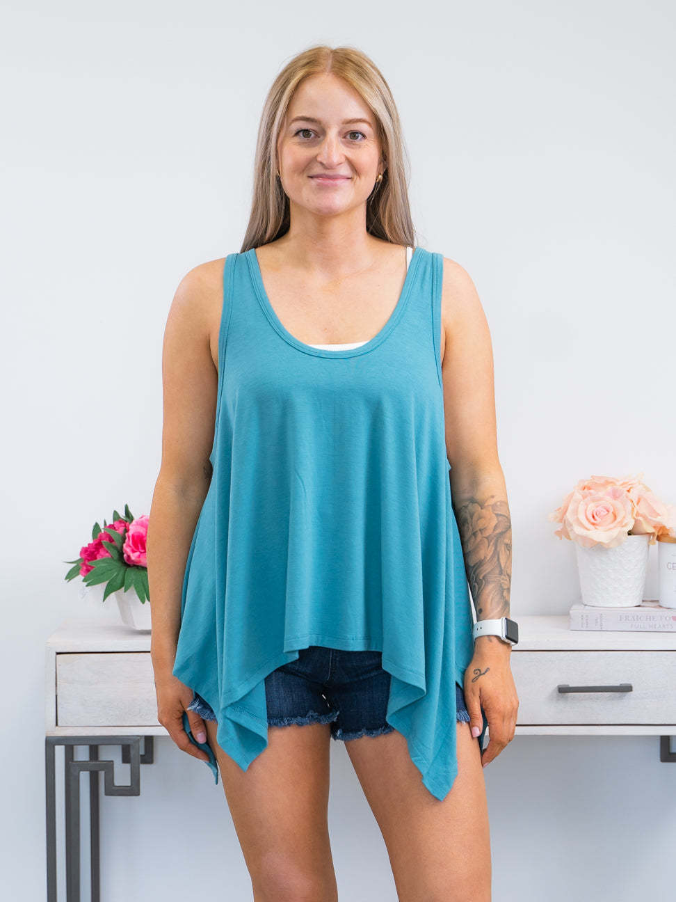 This Riri Shark Hem Tank from offers a stylish and comfortable look. It features a scoop neckline front and back, wide arm holes, and vertical seam detail down the back. Plus, a shark hem at the bottom provides a unique and eye-catching finish. Enjoy the feeling of softness on your skin with this bra-friendly tank.