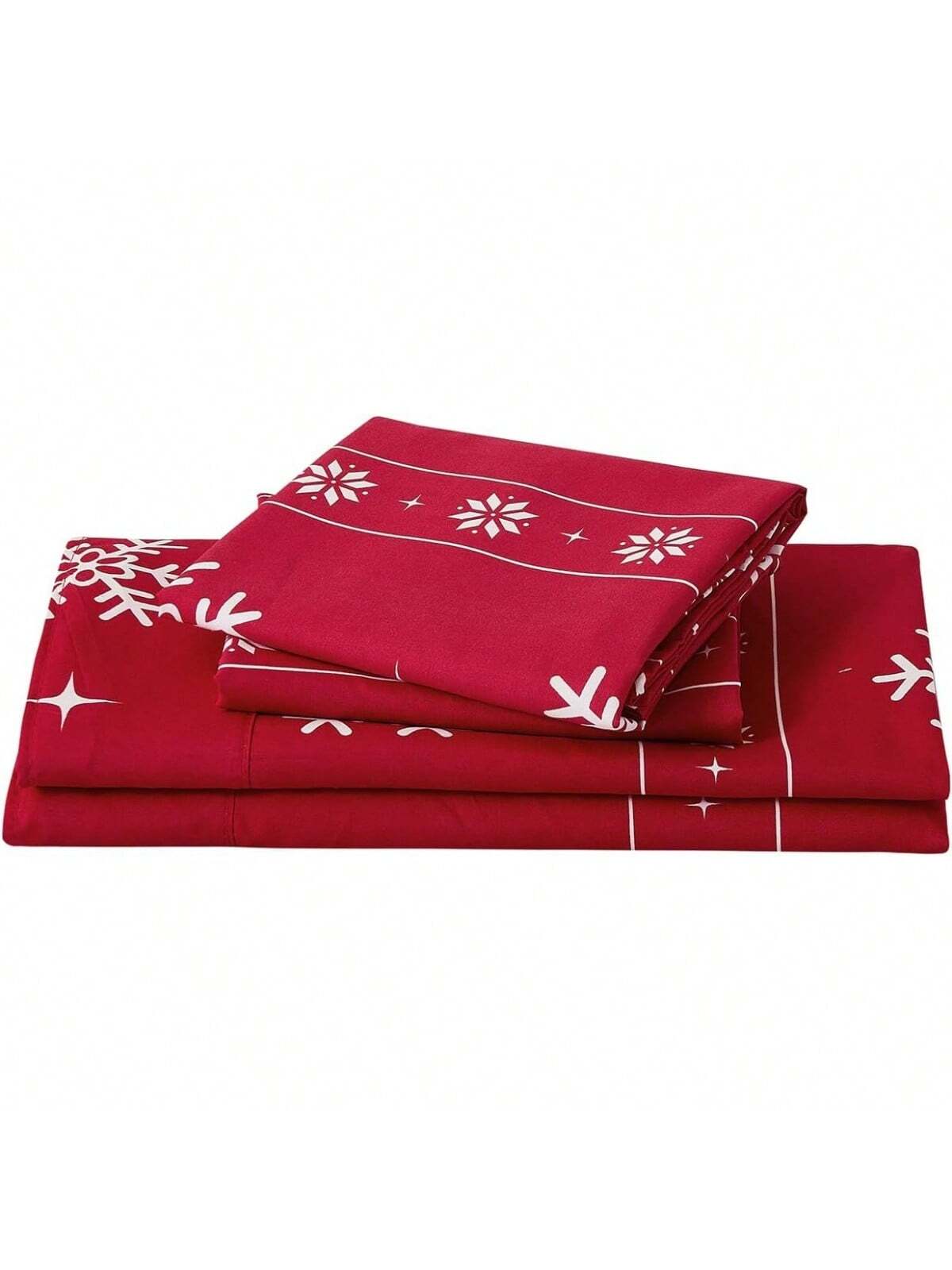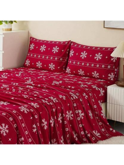 Soft Microfiber Sheets, Print Snowflake Pattern Christmas Holidays, 4-Piece Set (1 Fitted Sheet 1 Flat Sheet 2 Pillowcases) Red/White Snowflake, King Size