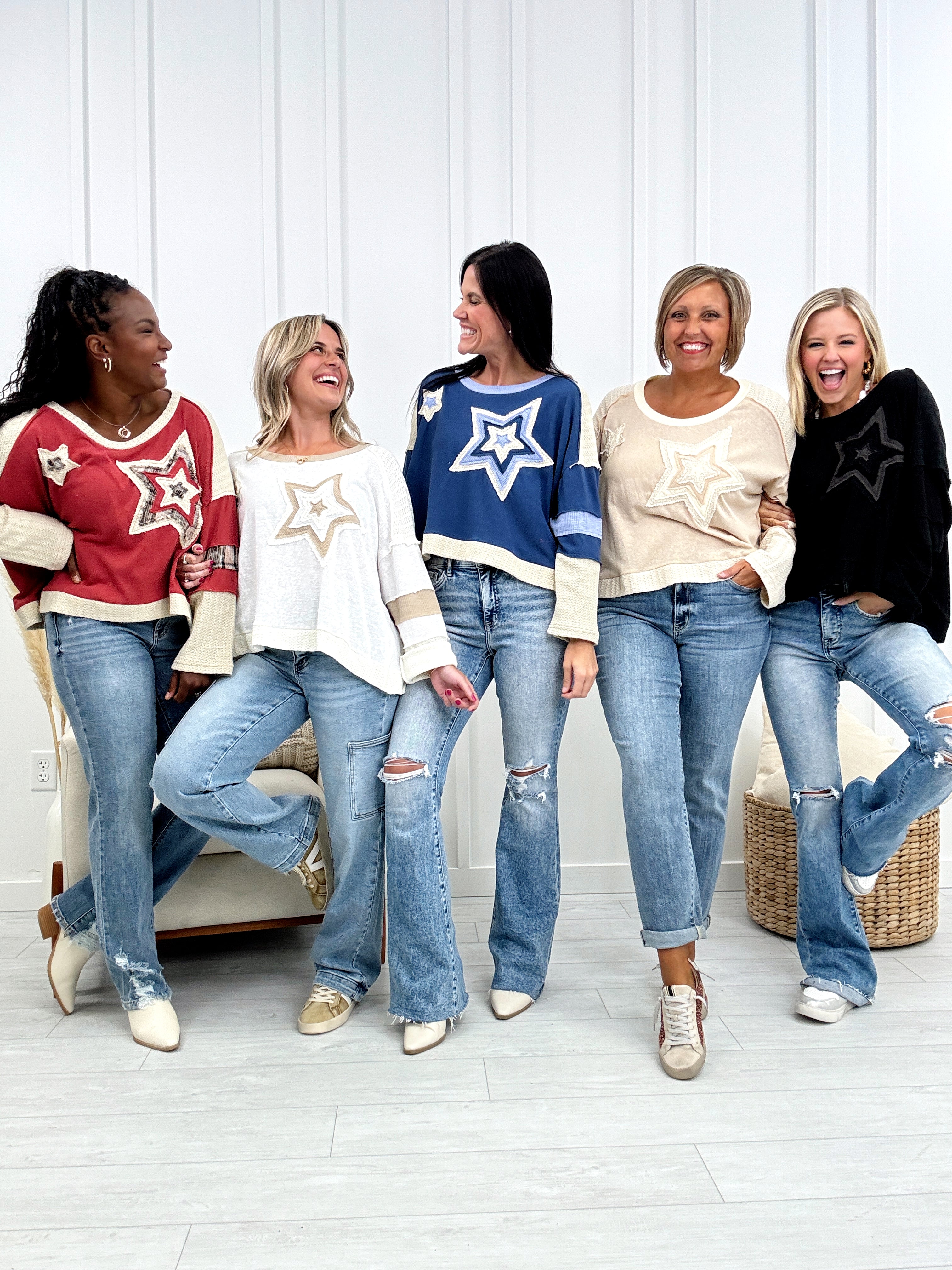 This insanely soft top features amazing details that set it apart. This multi fabric top features crochet on the sleeves, sewn on stars in multiple fabrics, and a star on the back of the top.
