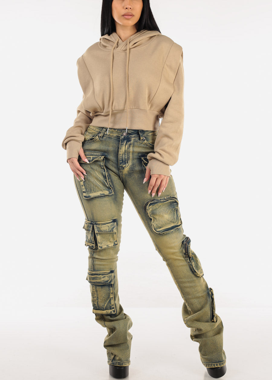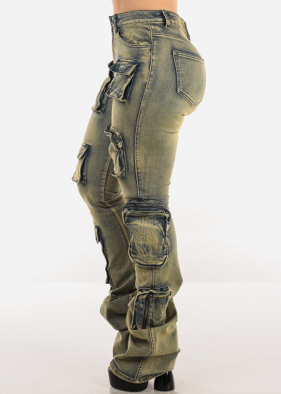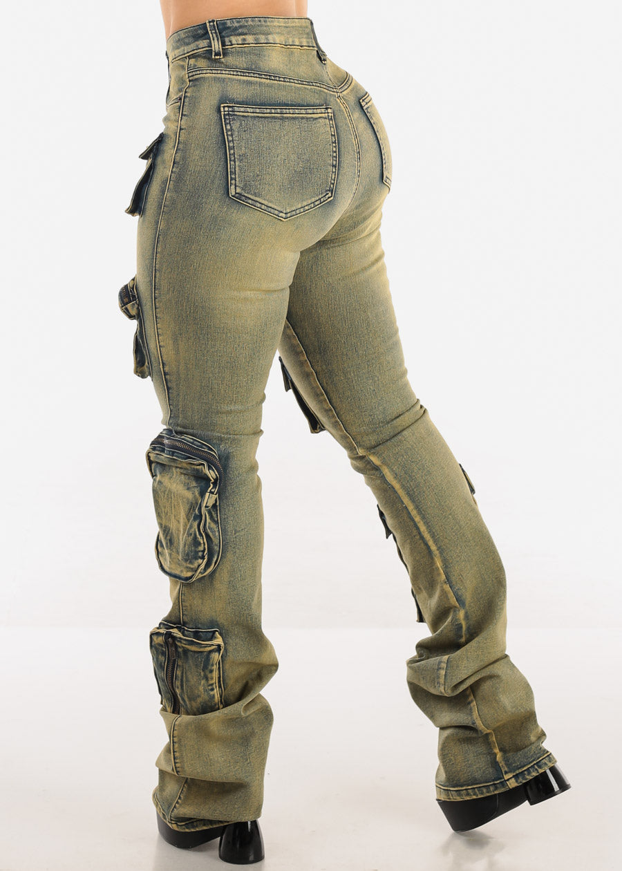 Stretchy High Waist Cargo Stacked Leg Jeans Vintage Wash