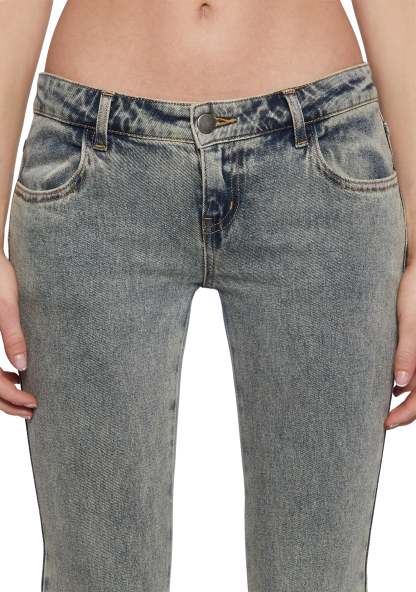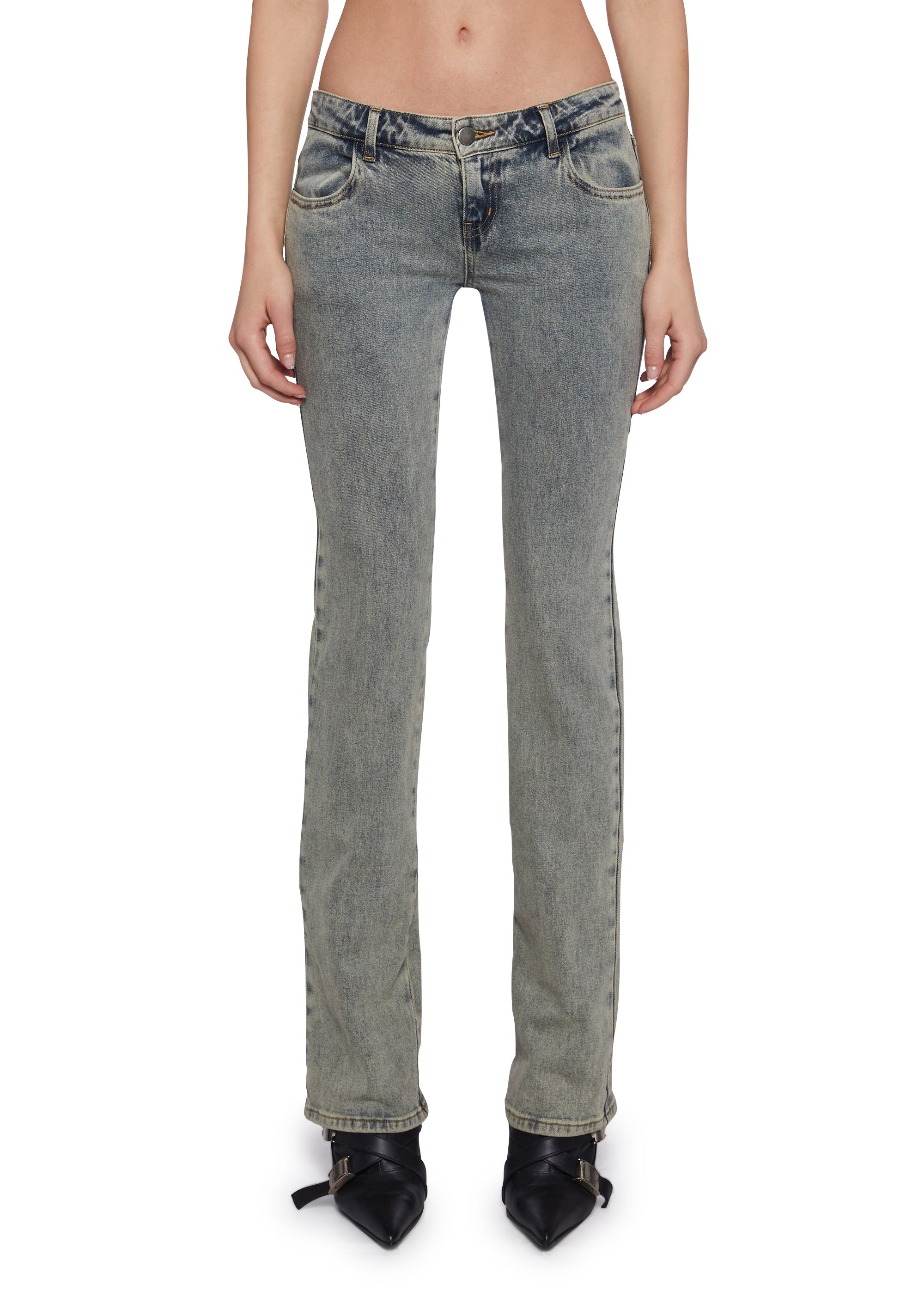 These low rise jeans have a washed denim construction, front pockets, a straight leg silhouette, and a front button and zipper closure