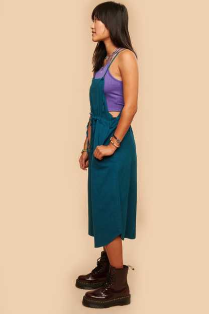 Feel your comfiest in this super adorable cotton overall jumpsuit that comes in an aura teal colorway! It includes adjustable tie shoulder straps, an adjustable tie waistband, front pocket at the chest, two side hip pockets, and oversized leg line.