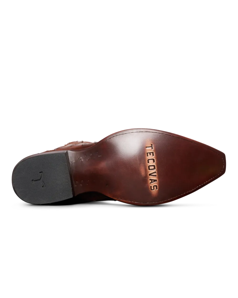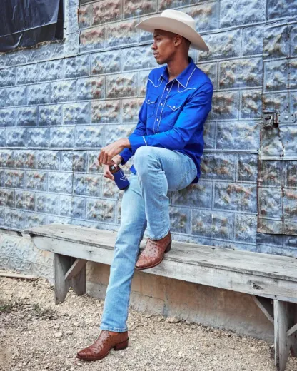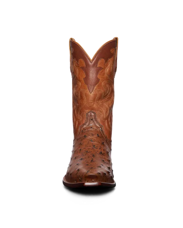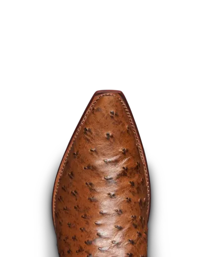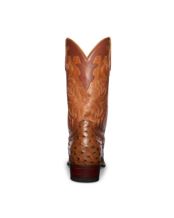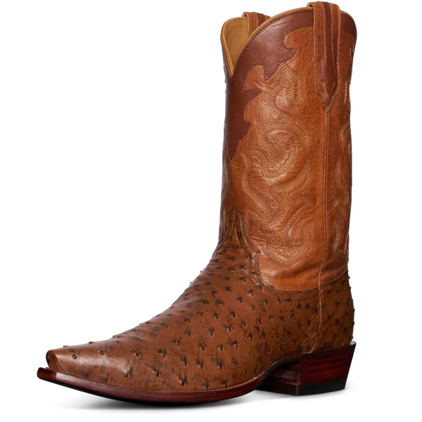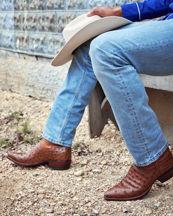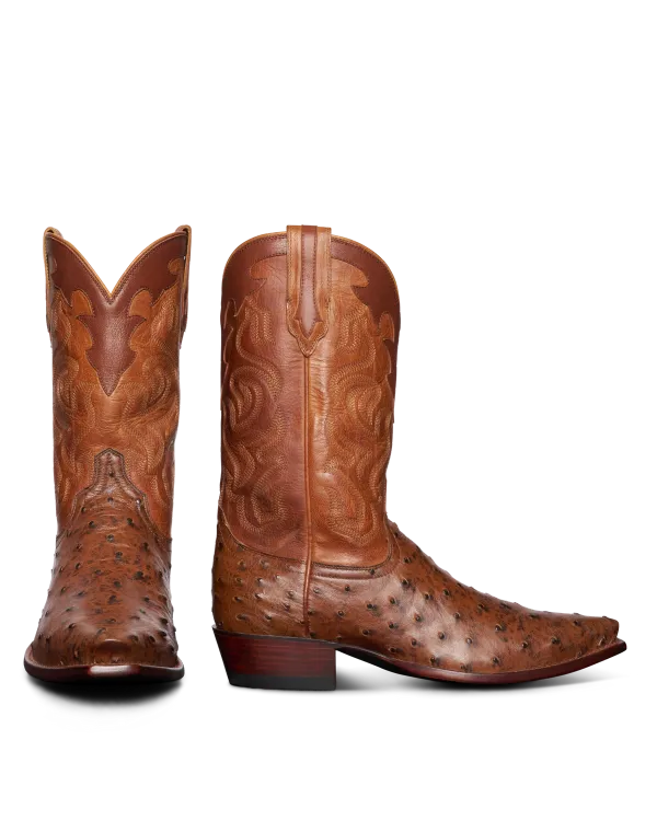 The Garrett is a snip-toe cowboy boot offered in quick-to-patina goat leather and quintessential full-quill ostrich. With design details from top to bottom, The Garrett is a handsome fella. A high standard for craftsmanship and creativity is set with our first collar and pull tab overlays and further emphasized by the intricate shaft stitching. In Cafe goat leather from top to bottom, The Garrett brings a rugged, classic sensibility to any outfit. Featuring a bovine shaft, the full-quill ostrich version in a new color we call “Peanut”, will dress up denim and slacks night or day.