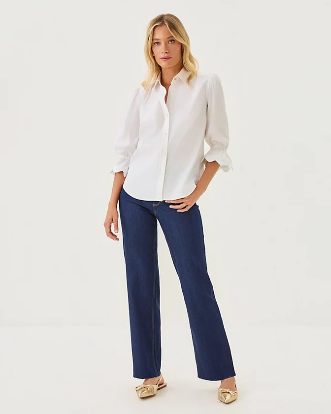 Straight fit, 3/4 sleeve, button down shirt with ric rac details.