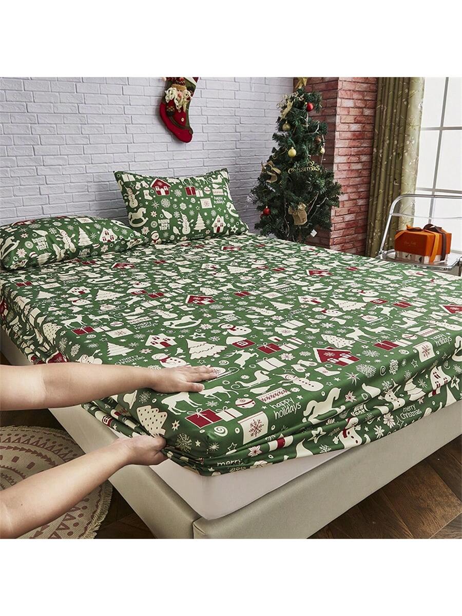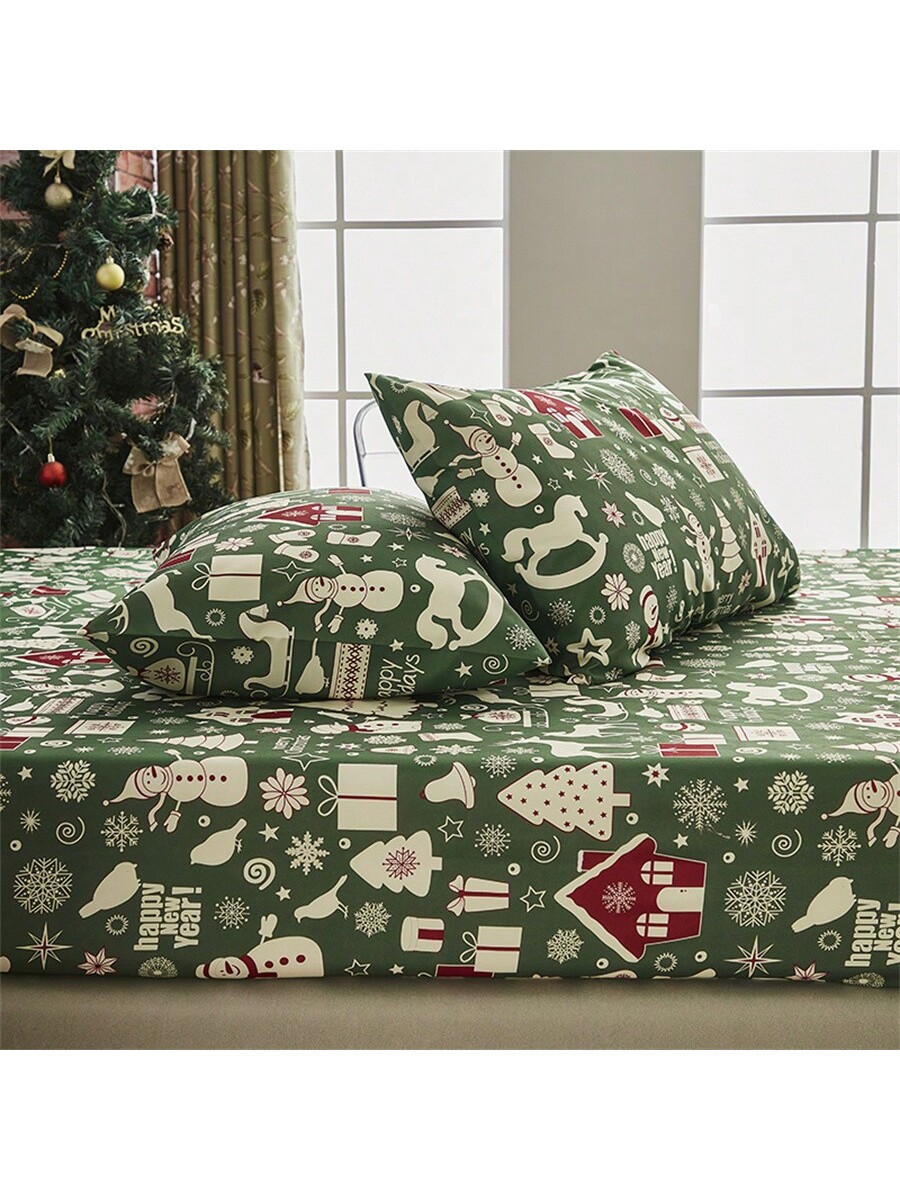 Three-piece Festive Winter Fitted Sheet Set With Printed Patterns, Including One Fitted Sheet And Two Pillowcases, Made Of Polyester Fiber And Decorated With Christmas Pattern Elements