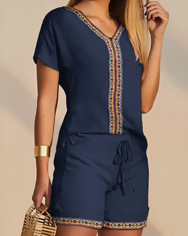 Tribal Print Patchwork Top & Drawstring Shorts Set
