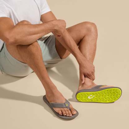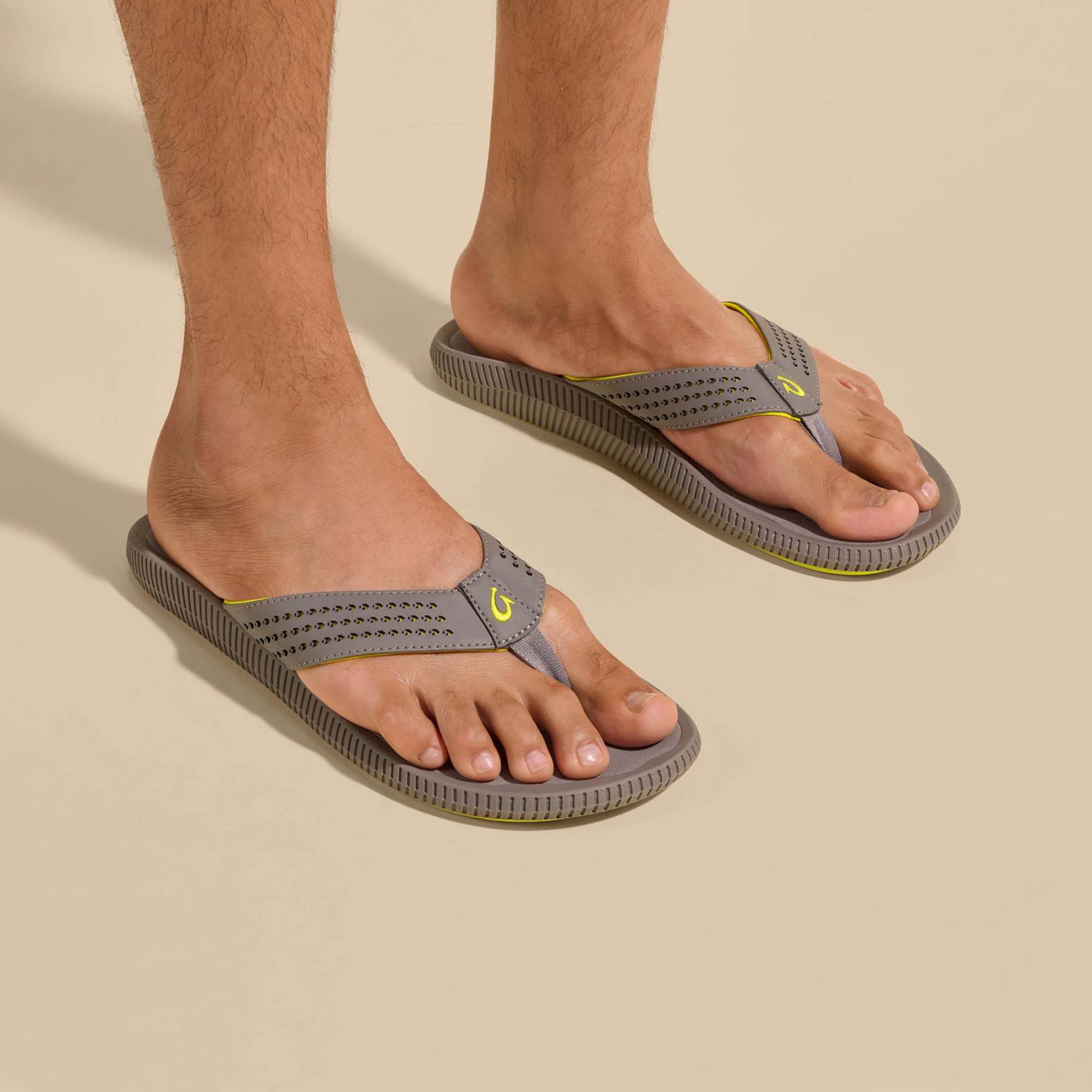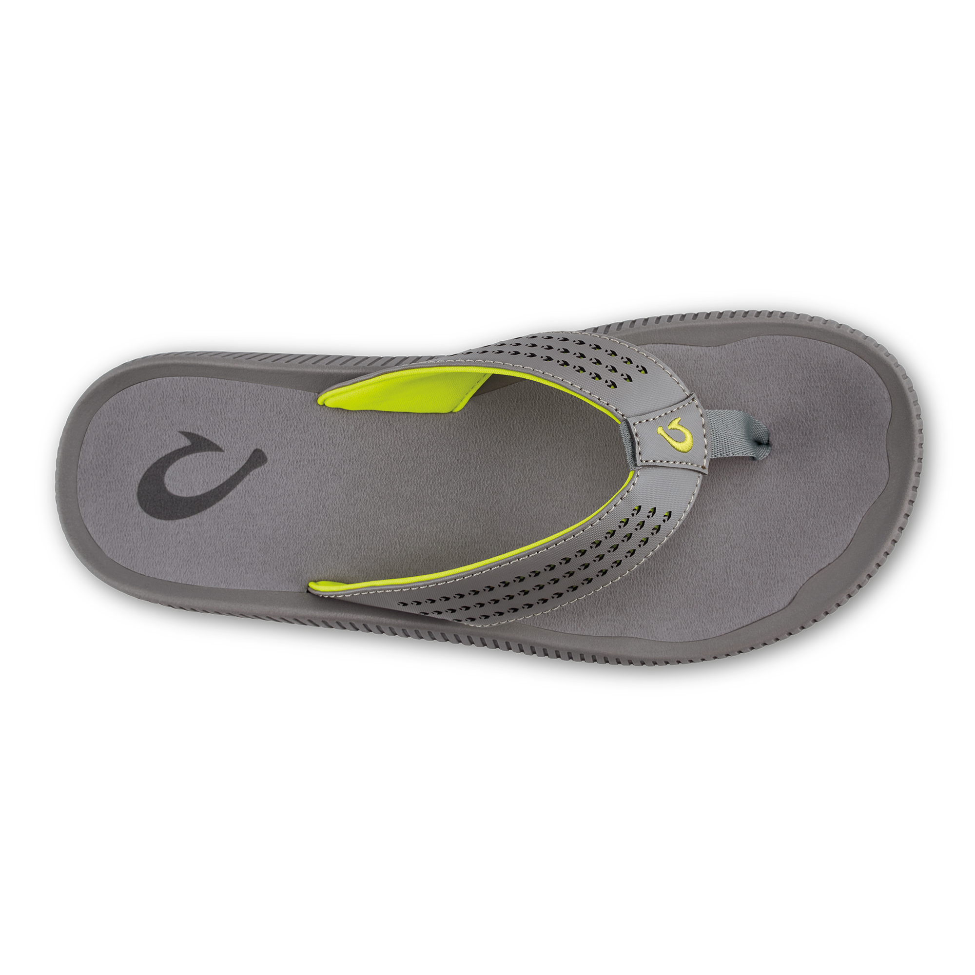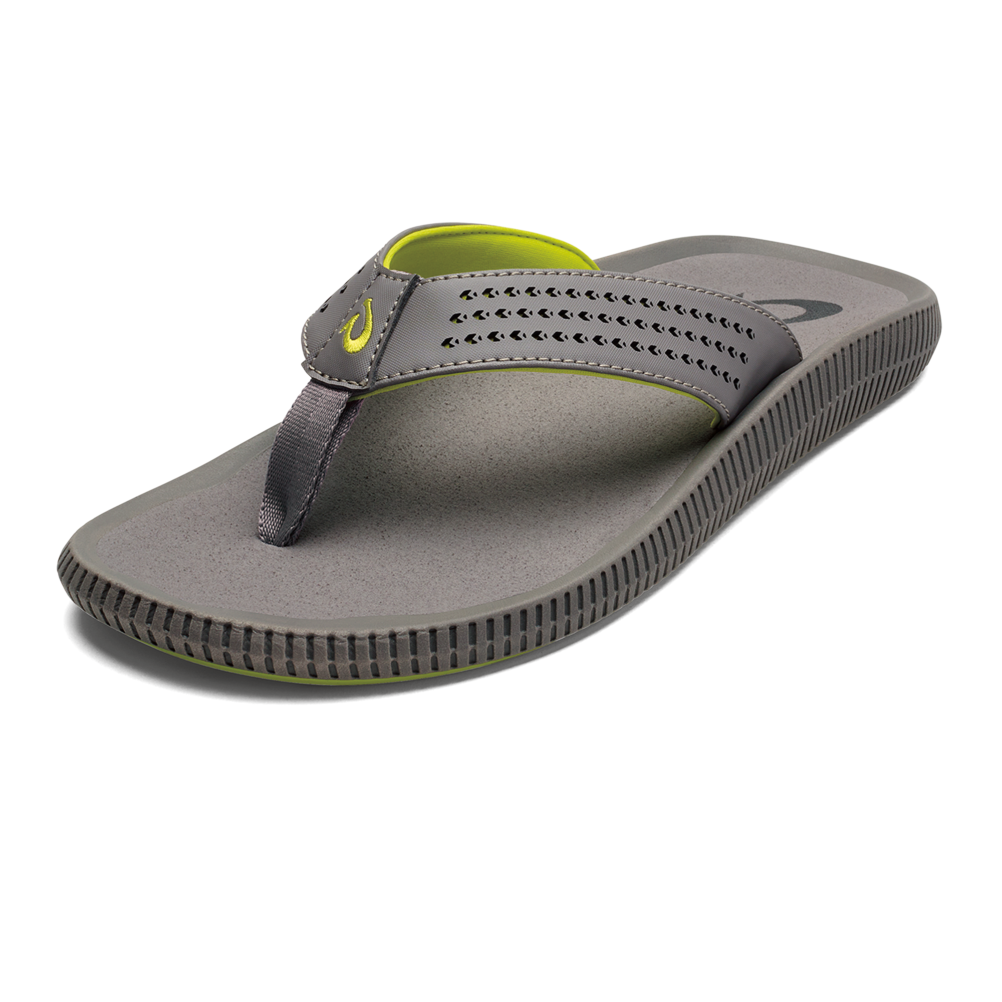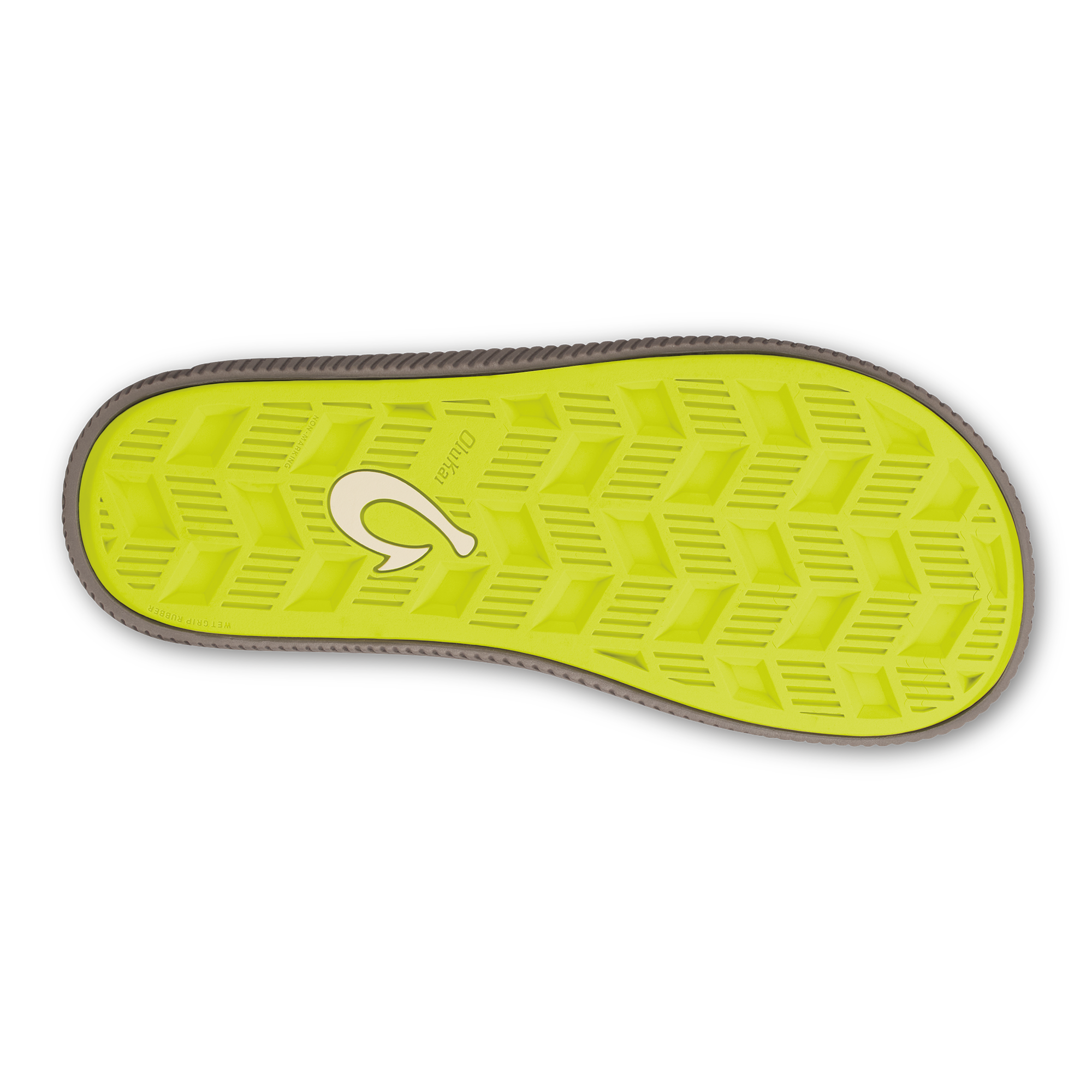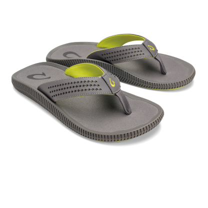 OluKai Craftsmanship: Features Kalo plant-inspired laser-cut upper straps and an embroidered hook logo.