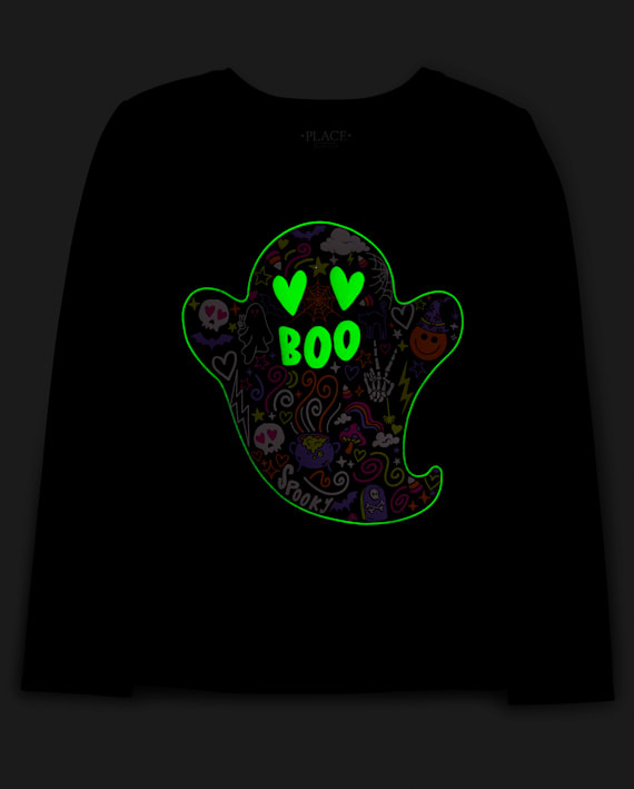 • FEATURES: Glow-in-the-dark 'Boo' with icon ghost graphic design, tagless label; for best glow effect, expose to light before wearing