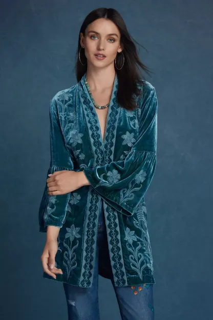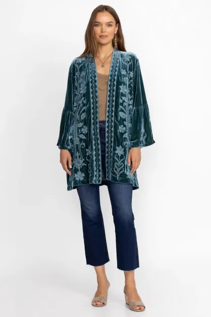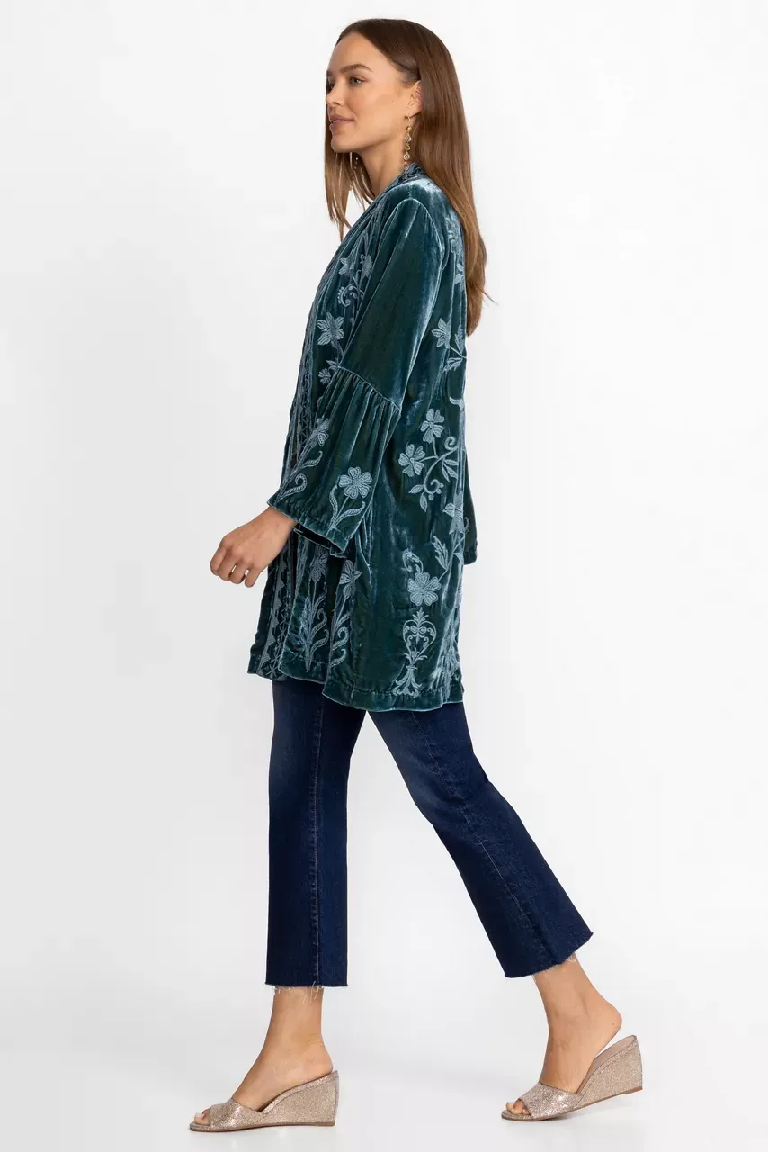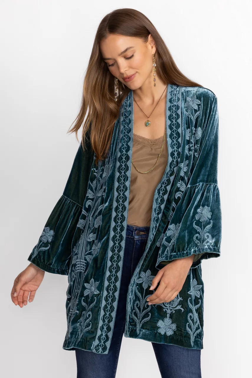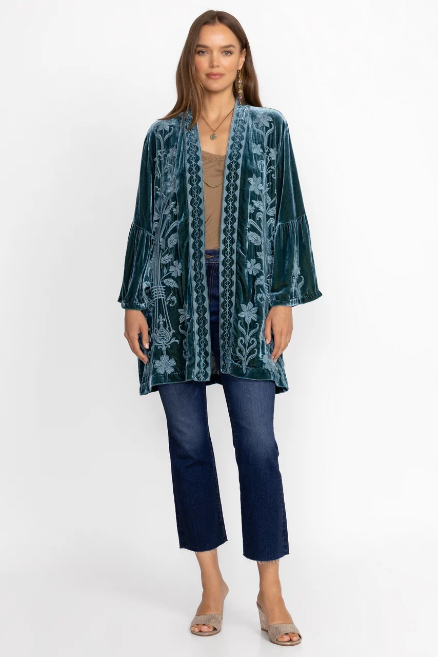 Embellished with intricate tone-on-tone floral embroidery, the Talithia Velvet Ruffle Sleeve Kimono is the perfect combination of comfort and impeccable style. Crafted from a unique silk blend, this kimono features an open front with a contrasting border and ruffled sleeves. Layer over a black dress and pair with classic pumps for an evening look.