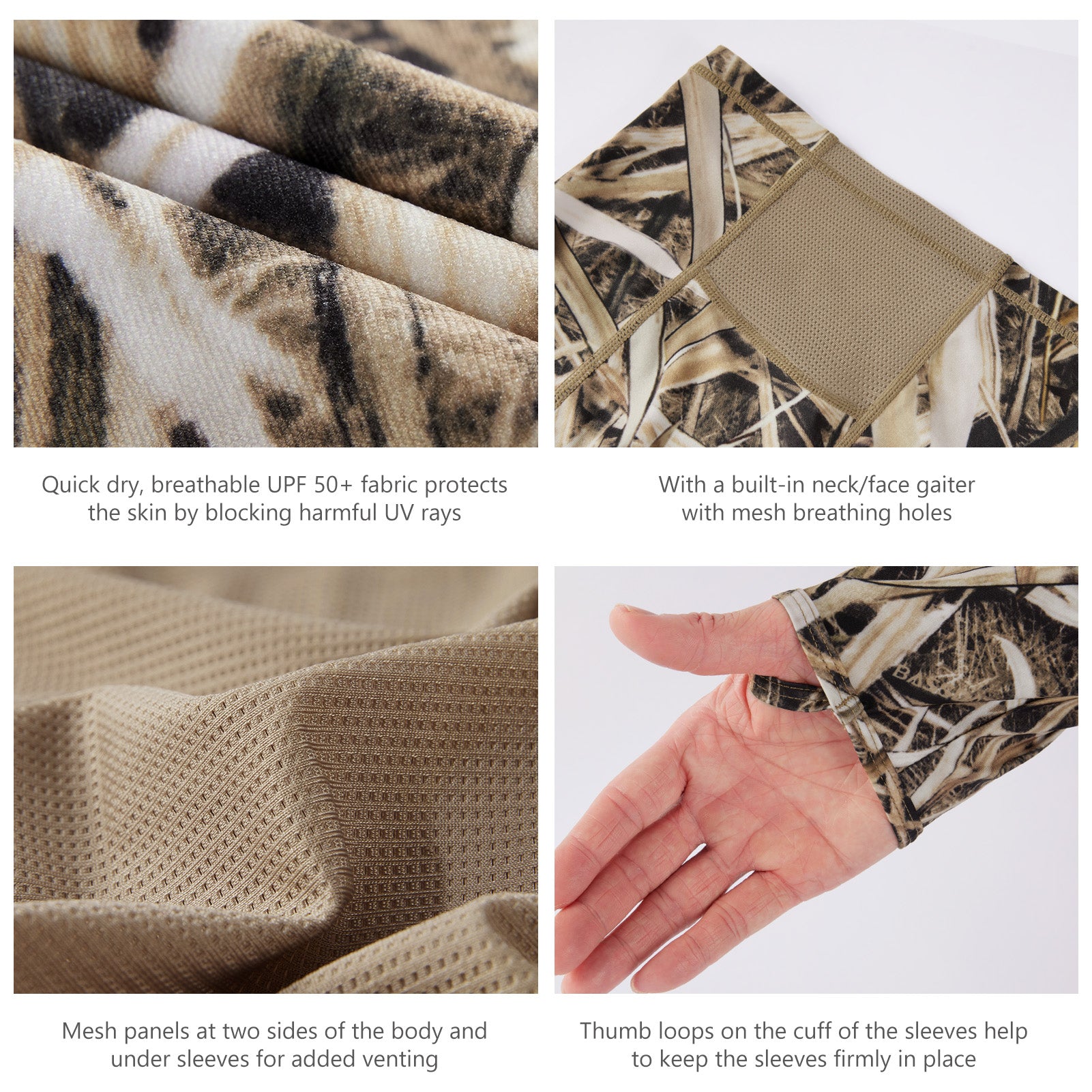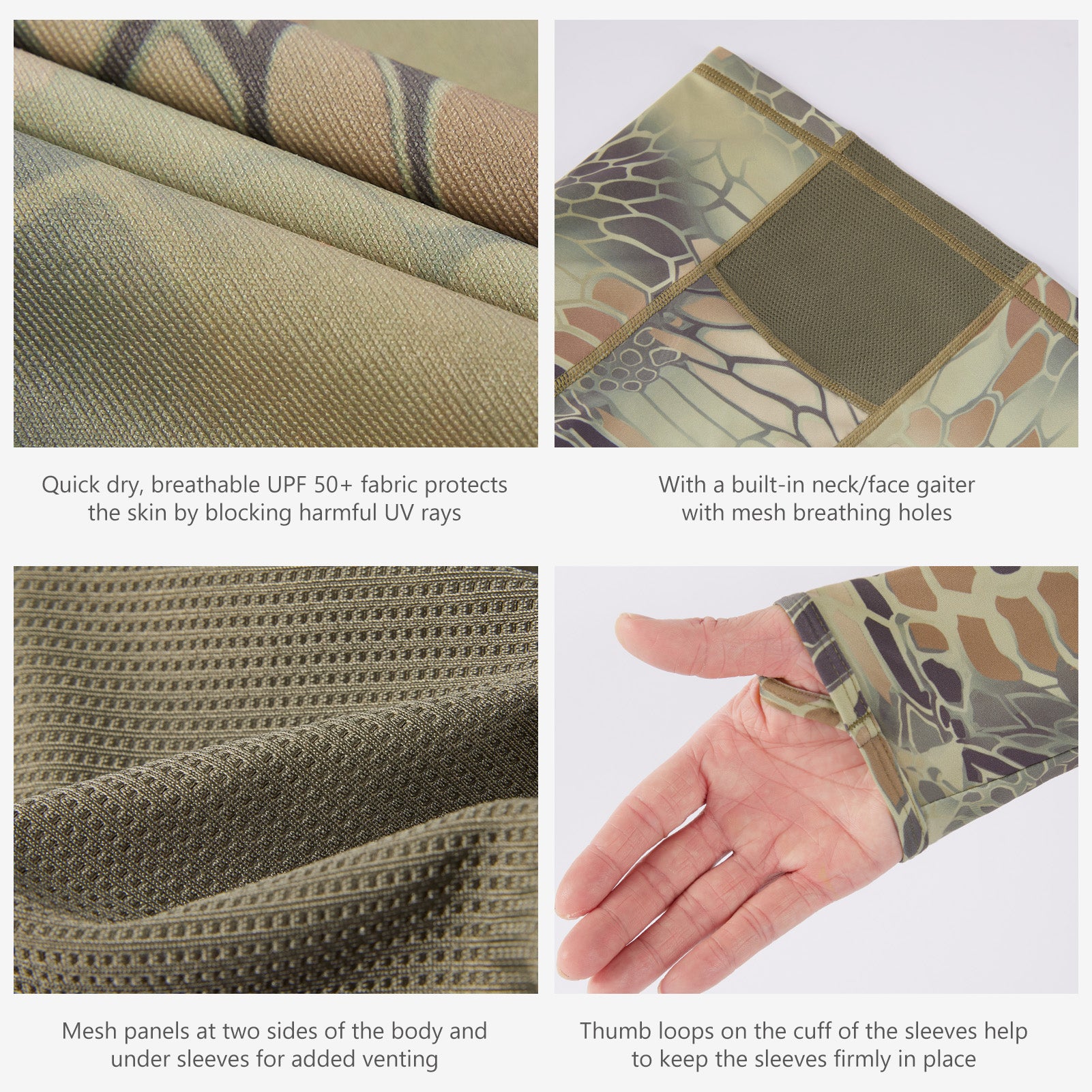 - Unique camouflage patterns designed with a focus on animal vision; The use of high contrast and colors found in the environment makes your body shape is difficult to discern