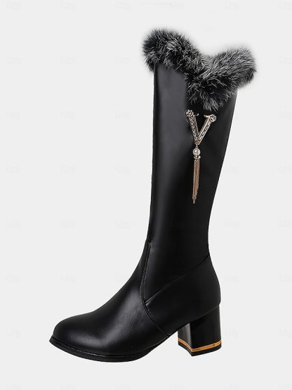Women's White Knee High Boots with Faux Fur Trim and Pearl Charm, Warm Winter Fashion Boots for Christmas & Cold Weather Outfits