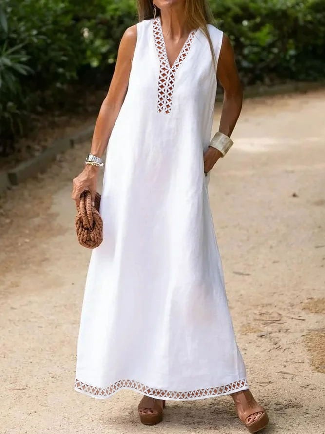 Women's Cotton Linen V Neck Lace Cutout Vacation Dress
