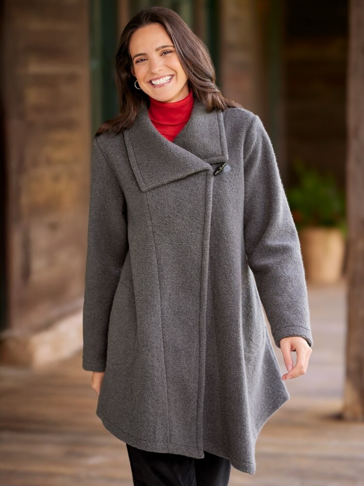 Wrap yourself in the warmth and effortless style of our berber fleece wool coat. It's designed with an asymmetric hemline for an elevated look and closes with a single toggle-closure button—it also includes a single small button on the inside to keep the crossover flap from moving when this cape-style coat is closed. It's the perfect balance between casual and dressy and gives every outfit a complete look.