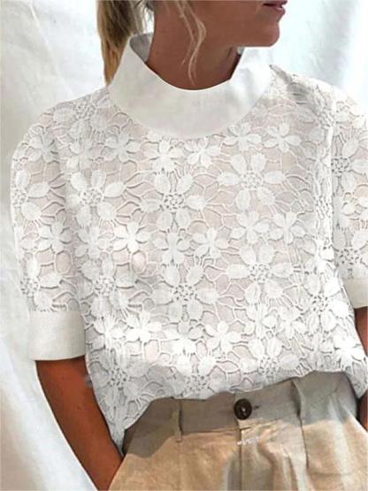 Women's Spring Summer Cotton Flower Embroidery Short Sleeve Turtleneck Shirt