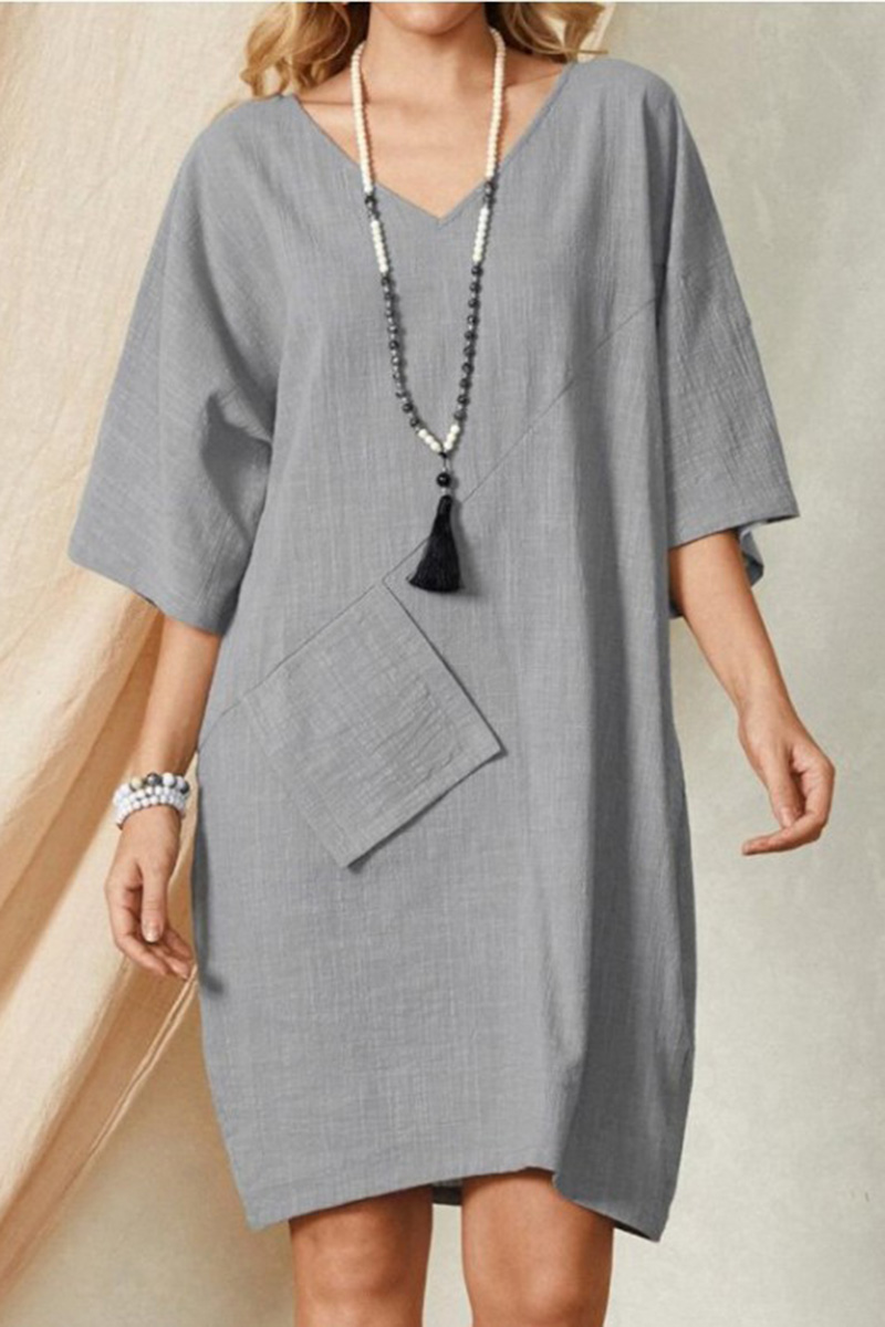 Plus Size Casual Grey Cotton And Linen Pocket 3/4 Sleeve V-Neck Mini Dress