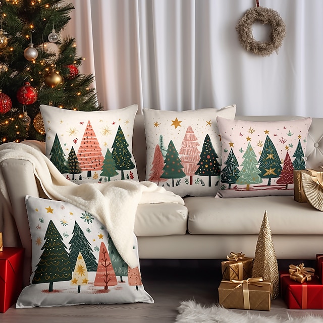 Christmas Tree Double Side Pillow Cover 4PC Scandinavian Folk Art Xmas Soft Decorative Square Cushion Case Pillowcase for Bedroom Livingroom Sofa Couch Chair