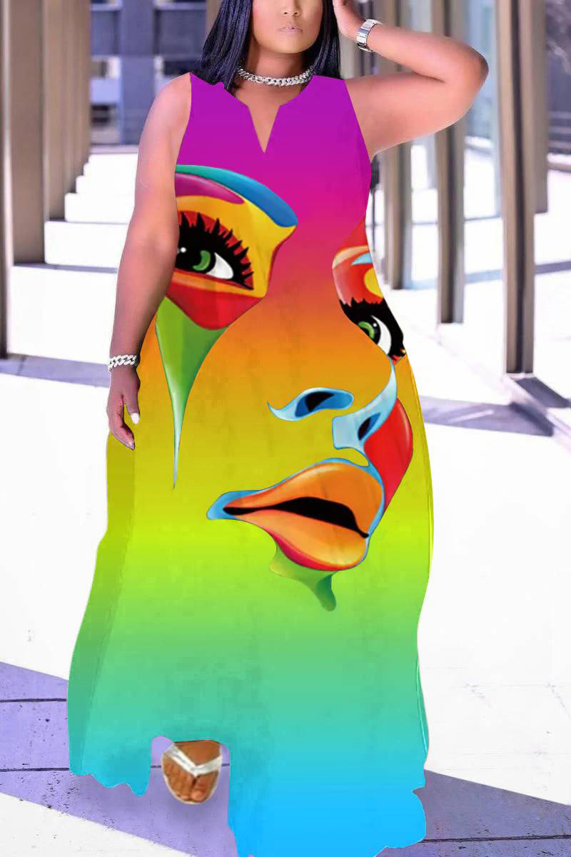 Plus Size Casual Rainbow Graphic Print Sleeveless V Neck Off Shoulder With Pockets Maxi Dresses [Pre-Order]