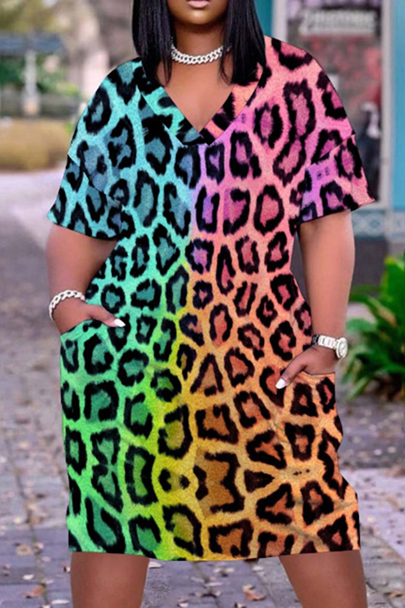 Plus Size Multicolor Casual Rainbow Leopard Print V Neck Midi Dresses [Pre-Order]