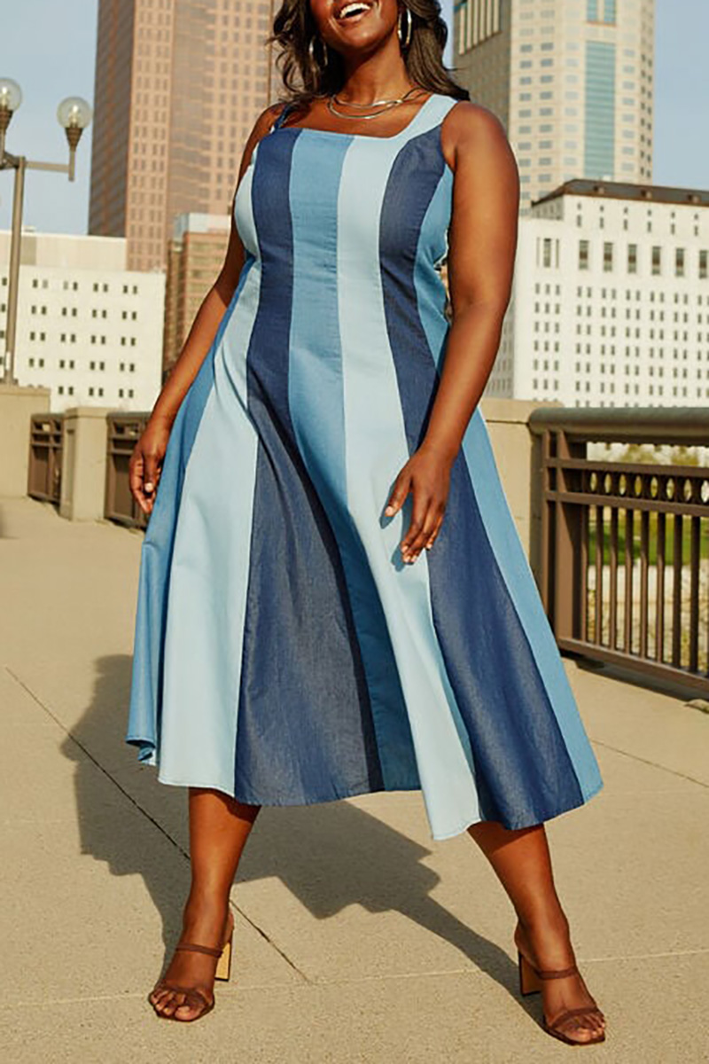 Plus Size Blue Daily Stripe Denim Sleeveless Patchwork Midi Dresses [Pre-Order]