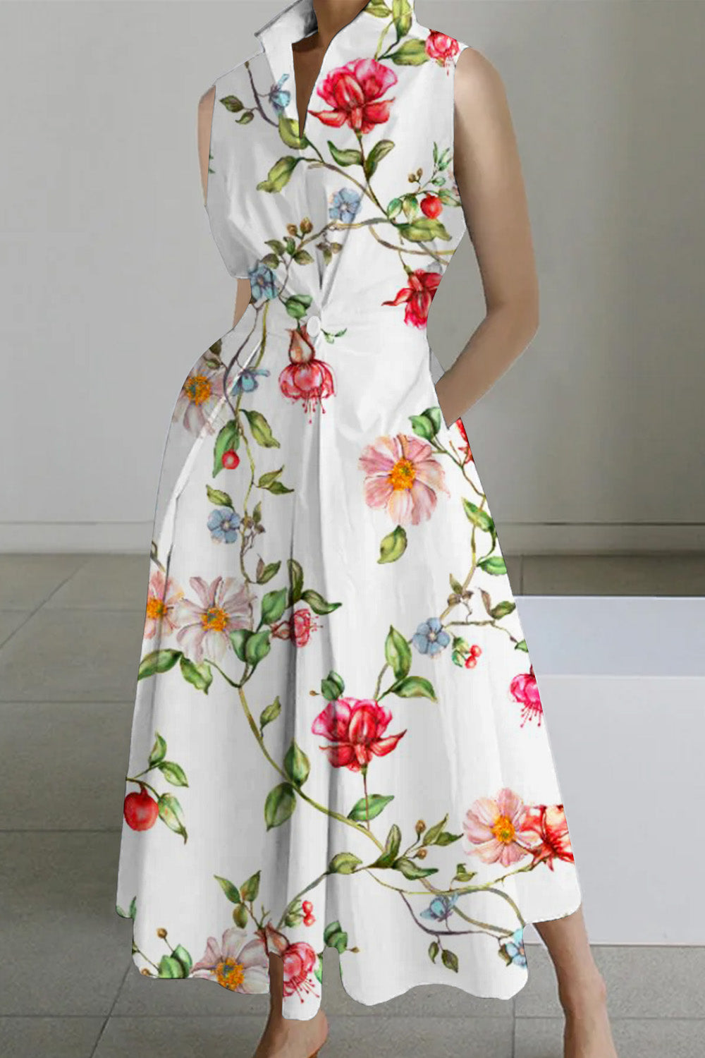 Romantic Print Shirt Collar Urban Cotton Midi Dress