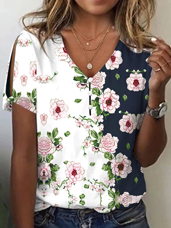 Animal & Rose Pattern Print Basic V Neck Short Sleeve T-shirt