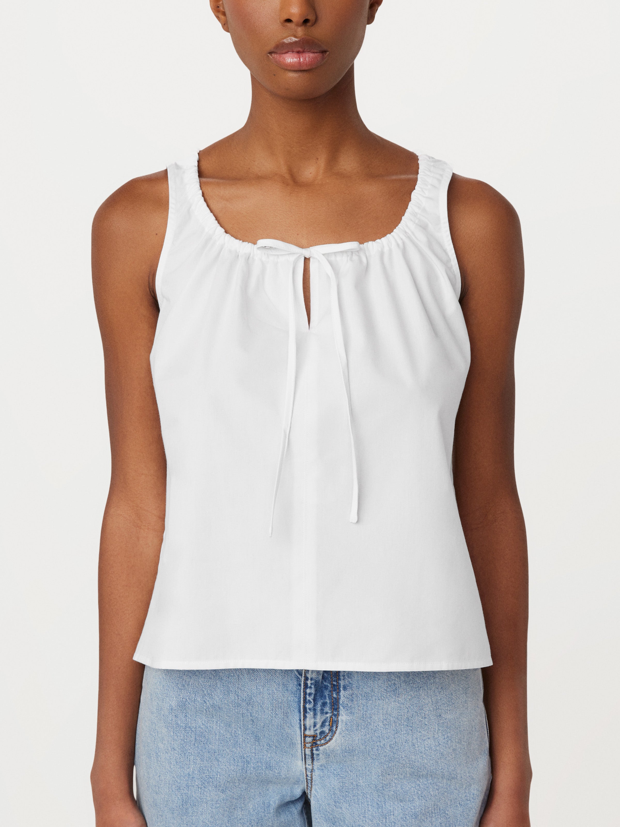 For slow-paced moments under the sun. This tank is made from an organic cotton light poplin fabric. Slightly A-line fit. Rounded square neckline. Features an adjustable tie with sheering at the centre front.