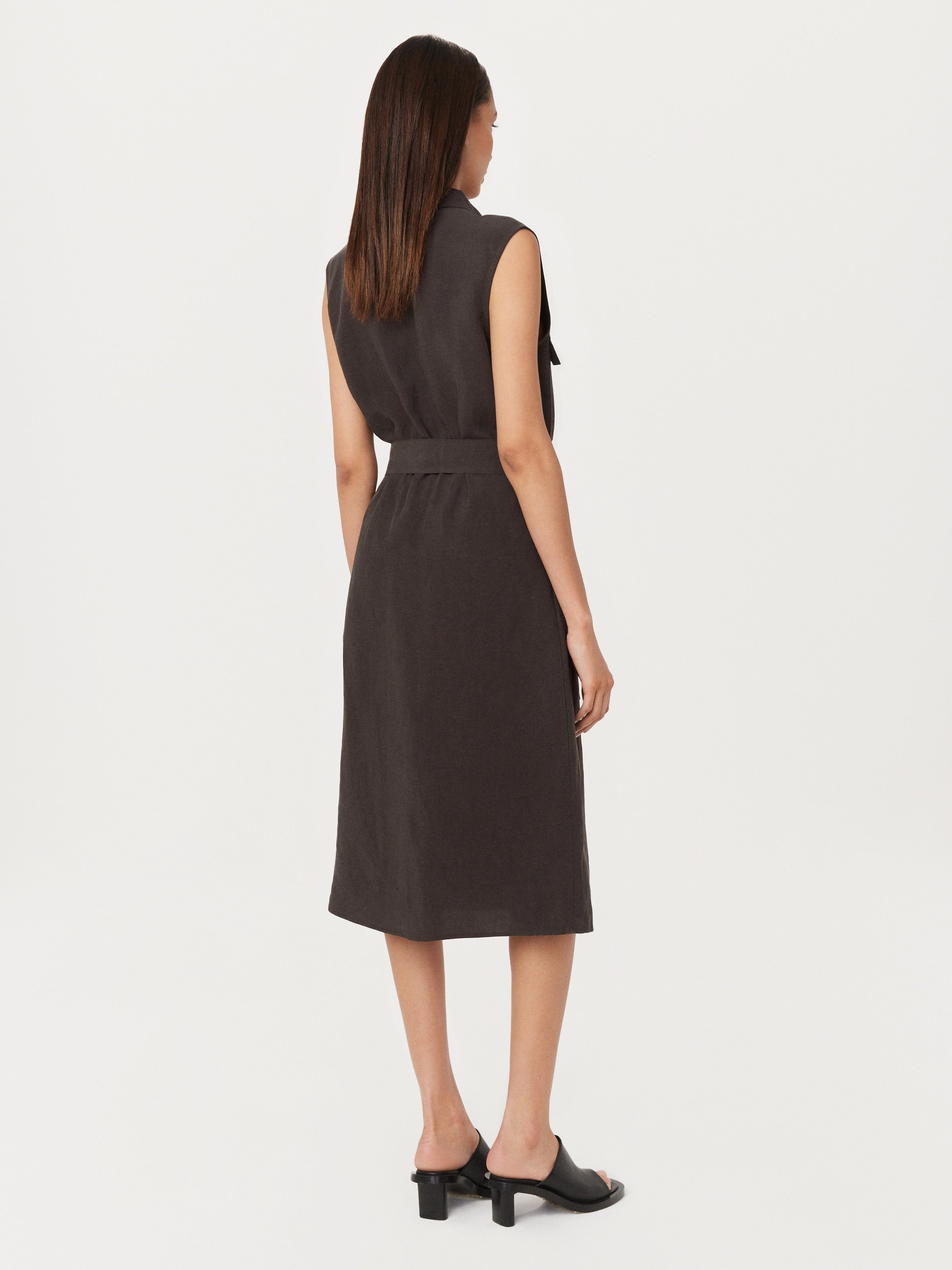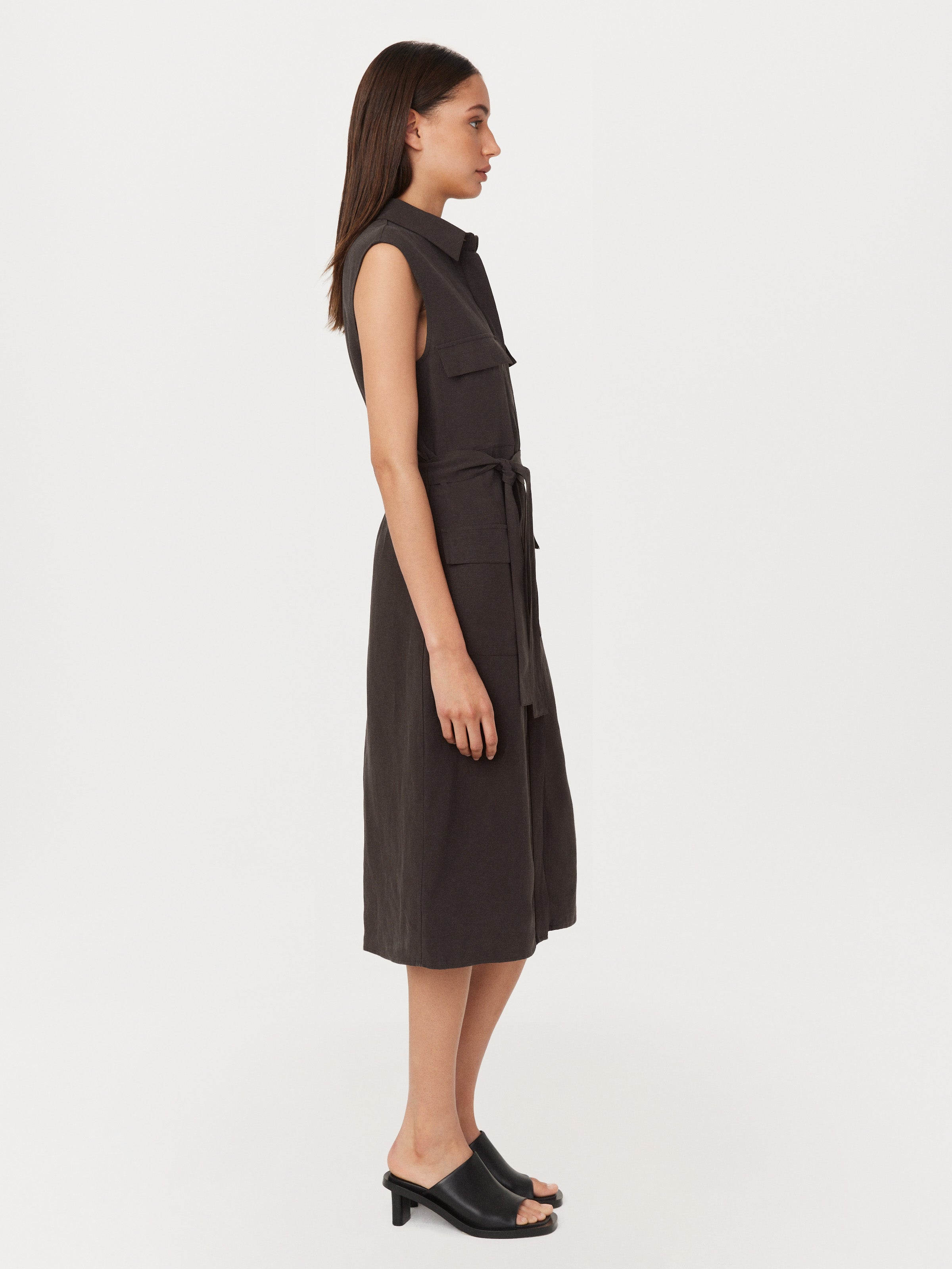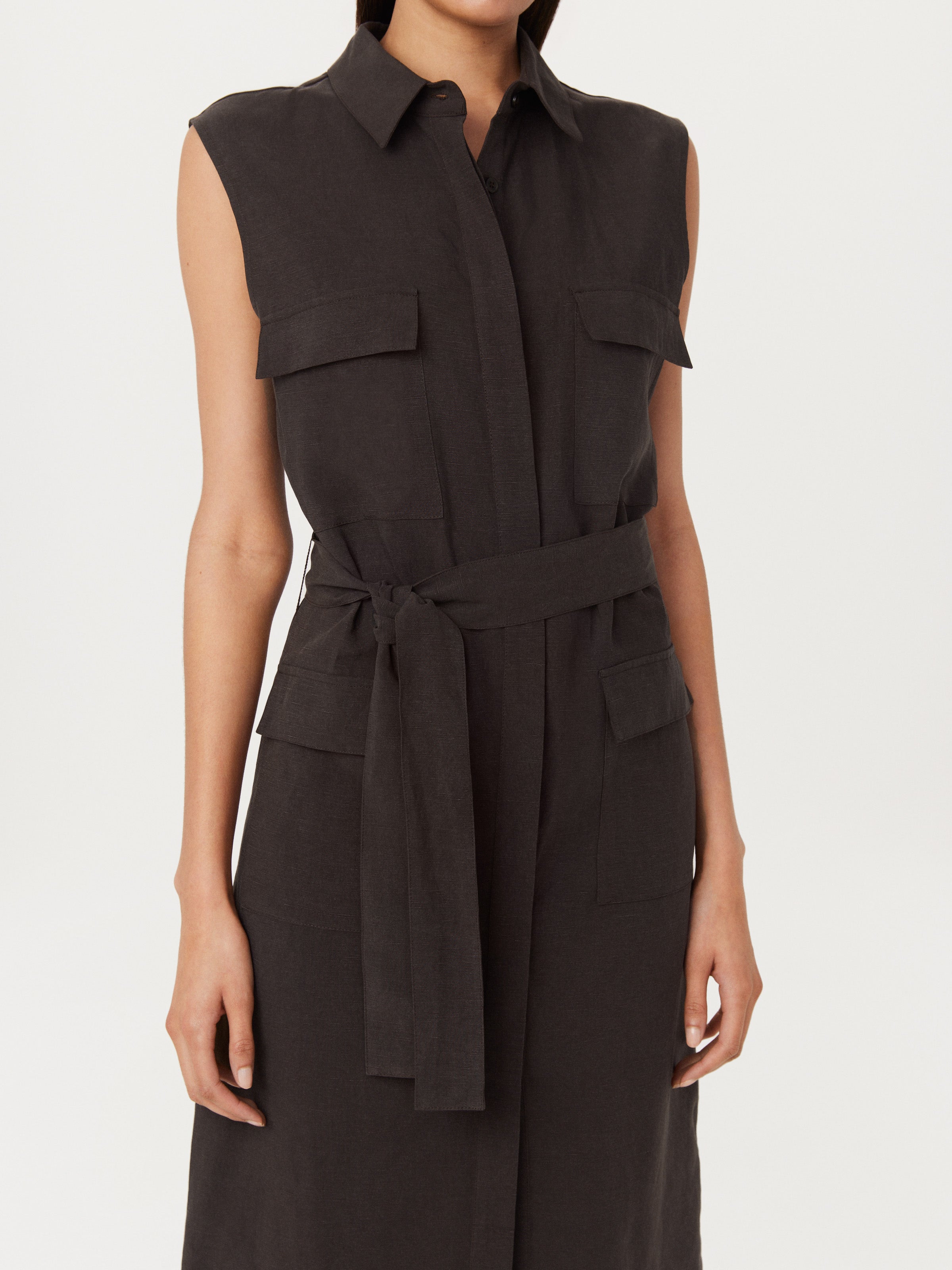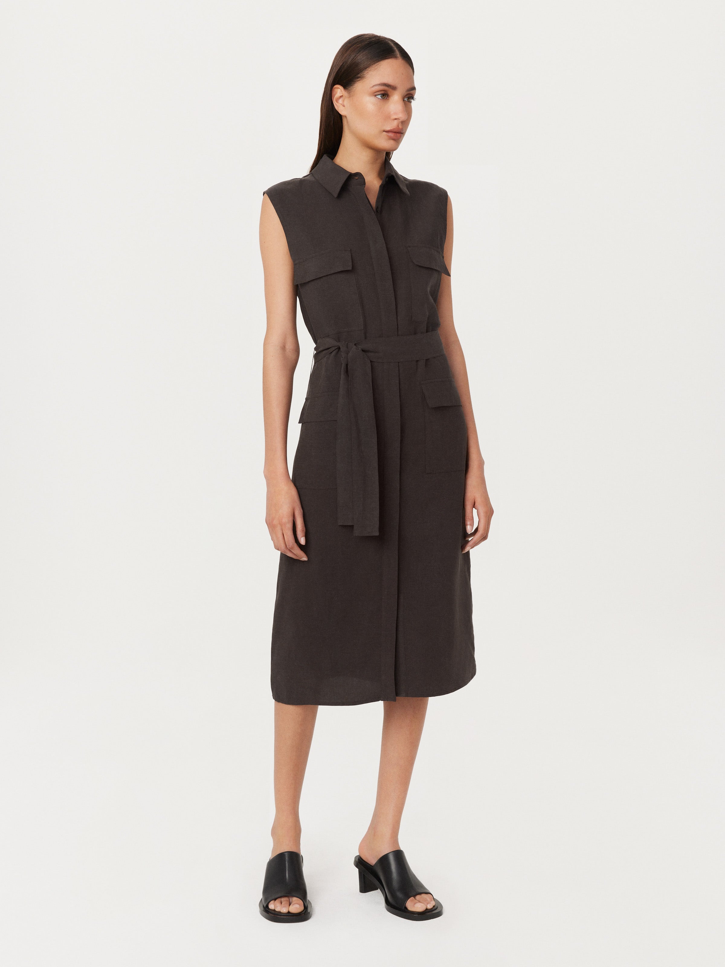 Elevate the everyday. This midi dress is made with a blend of TENCEL? Lyocell and linen. Features a fluid, slub fabric. Relaxed fit. Mid-calf length. Shirt collar. 4-patch pocket at the front. Self-belt at waist for a more fitted look.