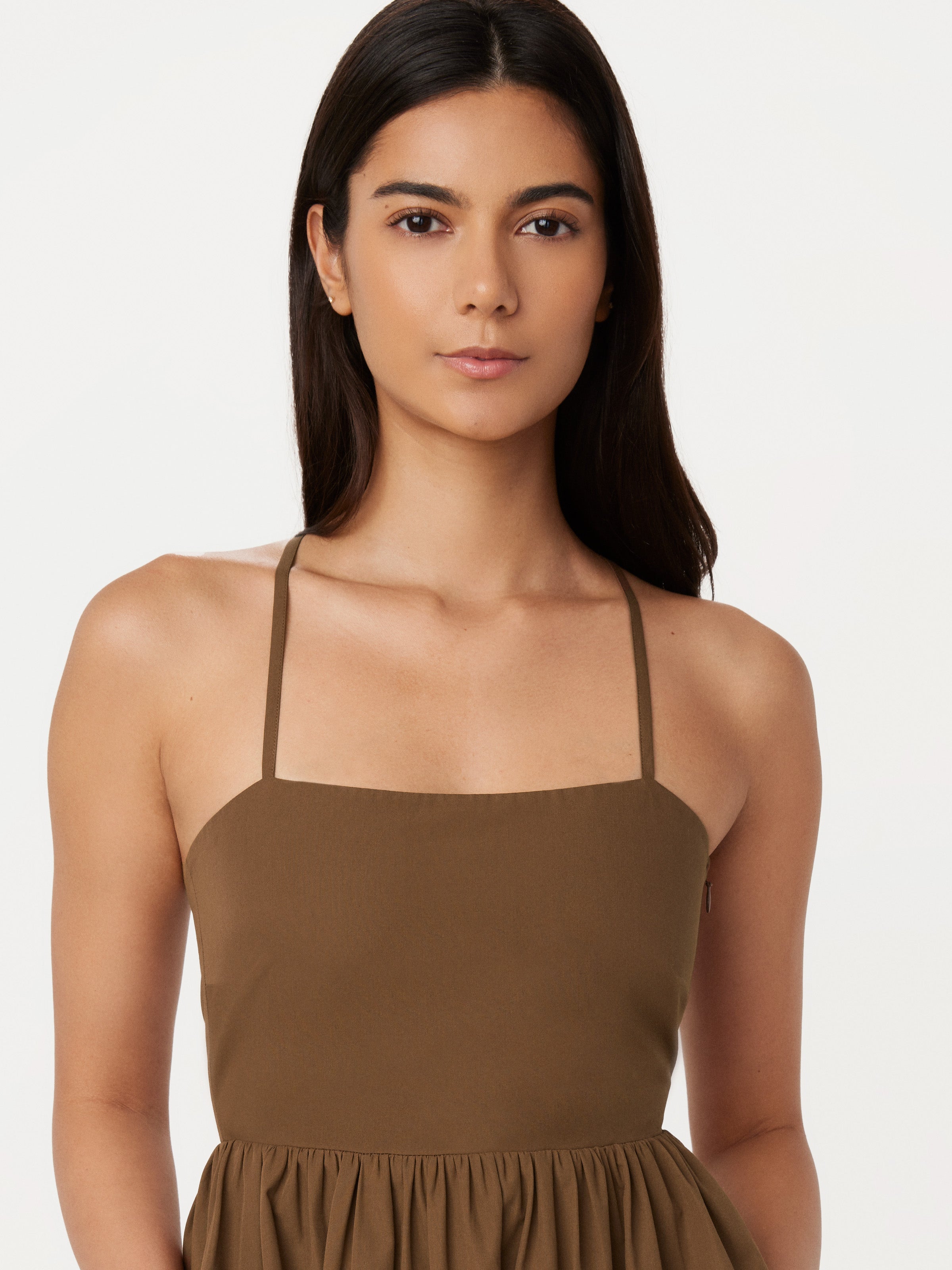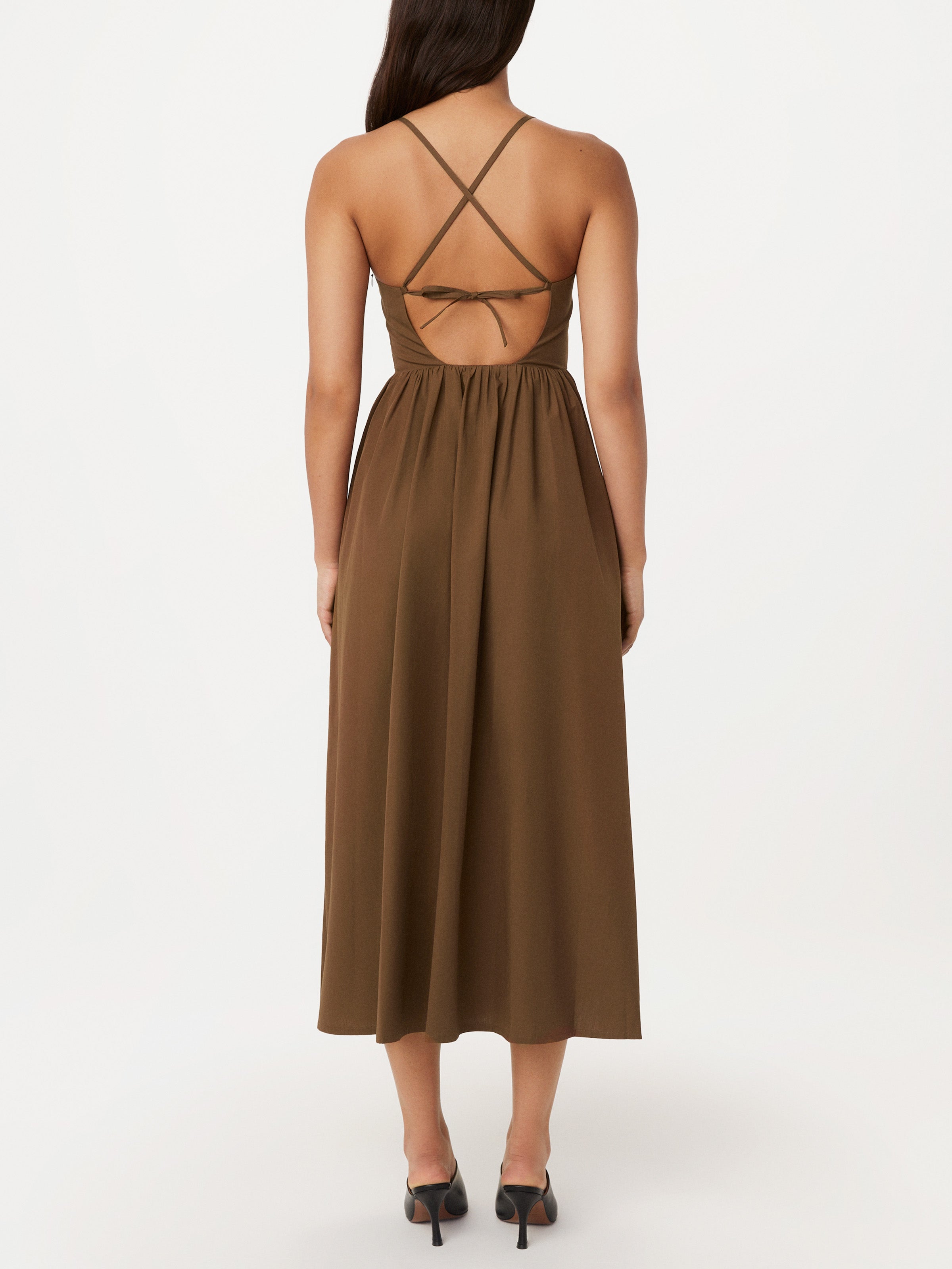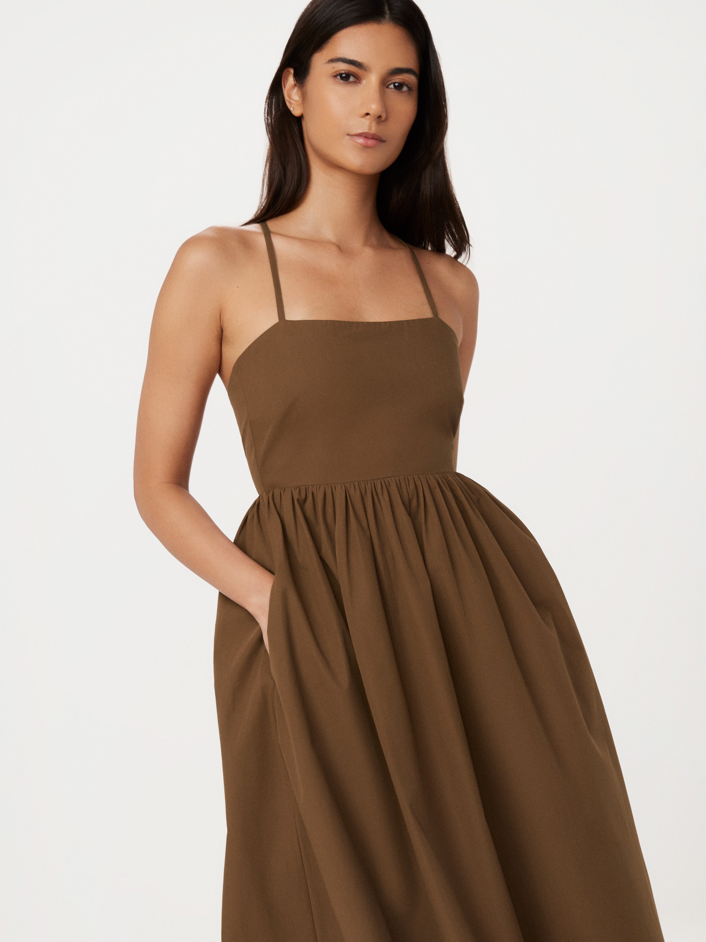 For slow-paced moments under the sun. This maxi dress is made from a lightweight organic cotton poplin fabric. Long length. Fitted at the top. Voluminous at the bottom. Features an open back with adjustable slim straps. Two pockets in the side seams.