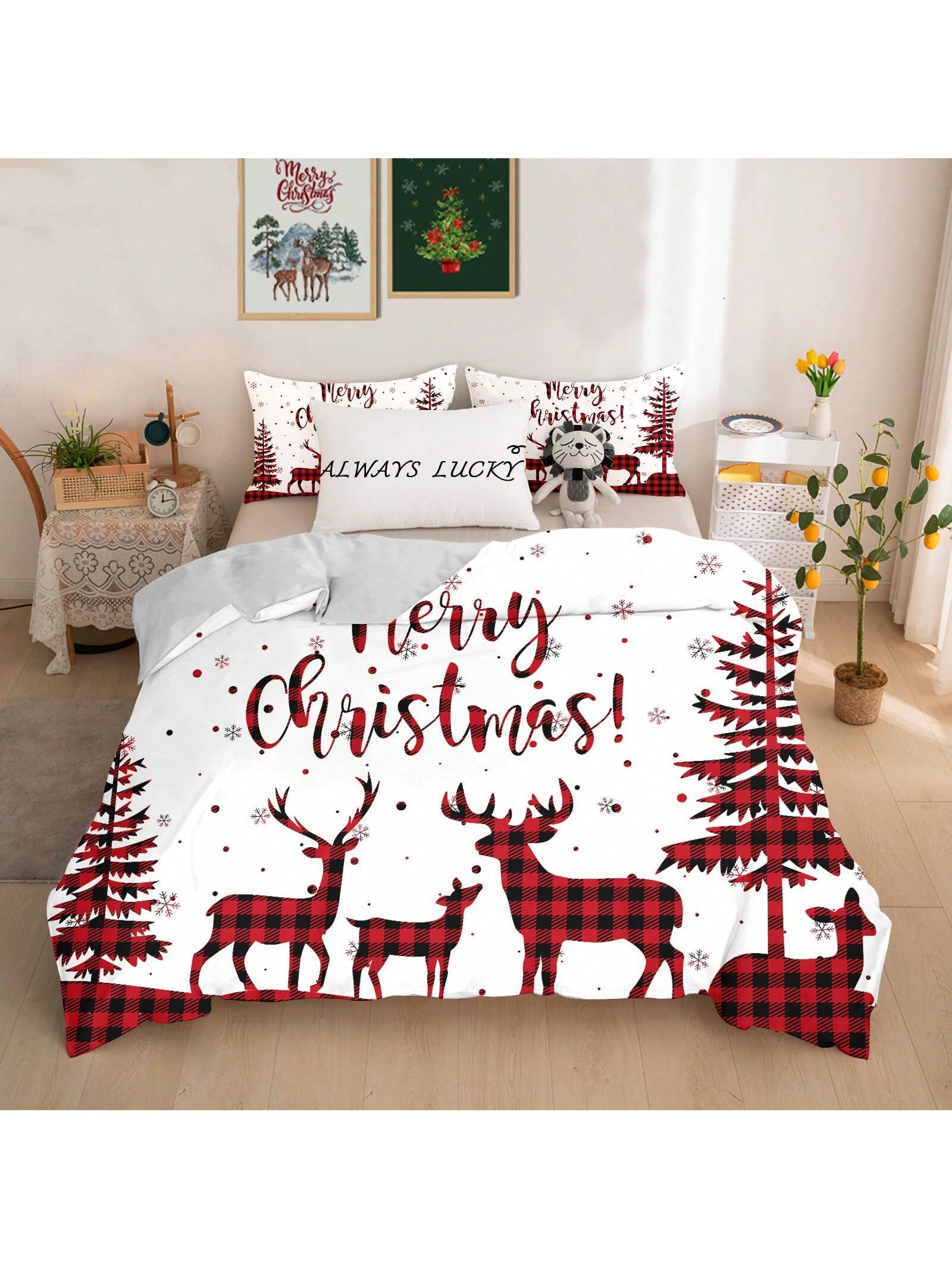3pcs Merry Christmas Duvet Cover Set, Plaid Reindeer Christmas Tree Print Bedding Set, Soft Comfortable Duvet Cover, For Bedroom, Guest Room