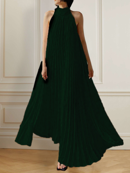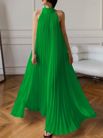 A-Line Sleeveless Pleated Solid Color Halter-Neck Maxi Dresses