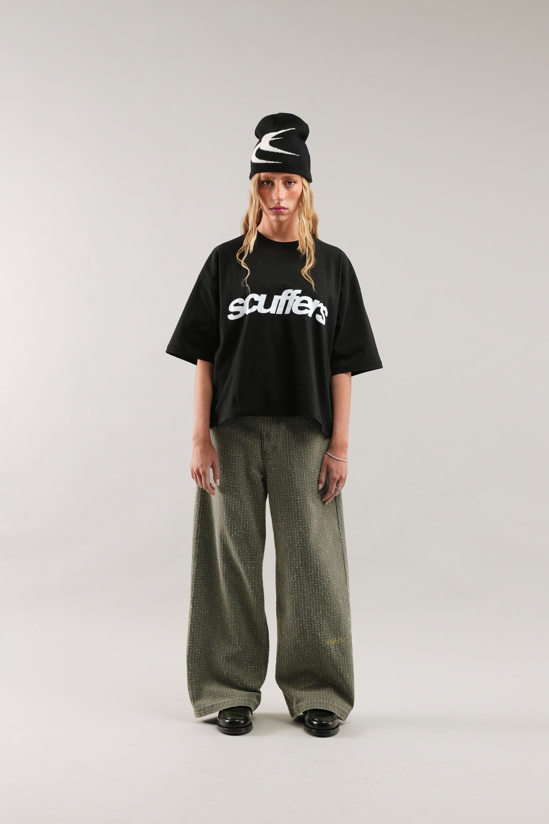 Black Knit Beanie with a snug, flexible fit. Made from soft, lightweight material for all-day comfort. Features a bold white Scuffers logo graphic on the front. Simple and versatile for casual wear.