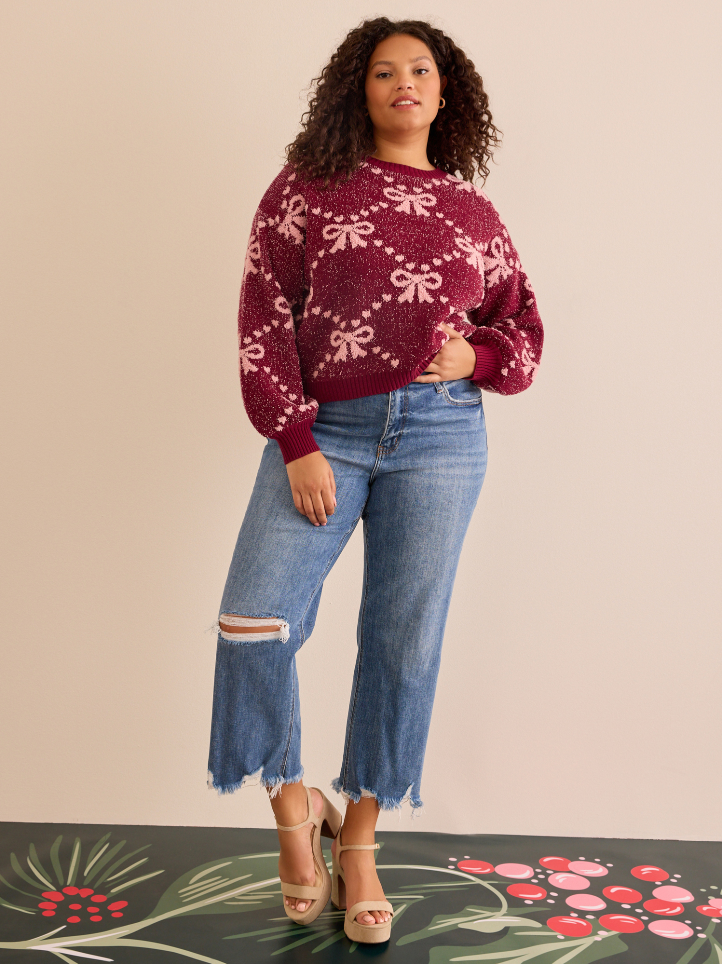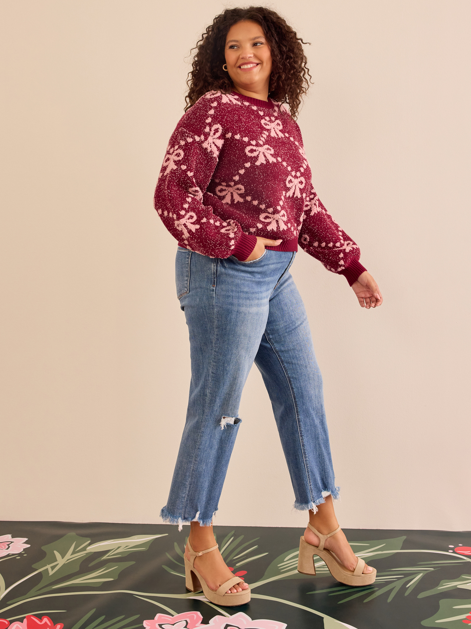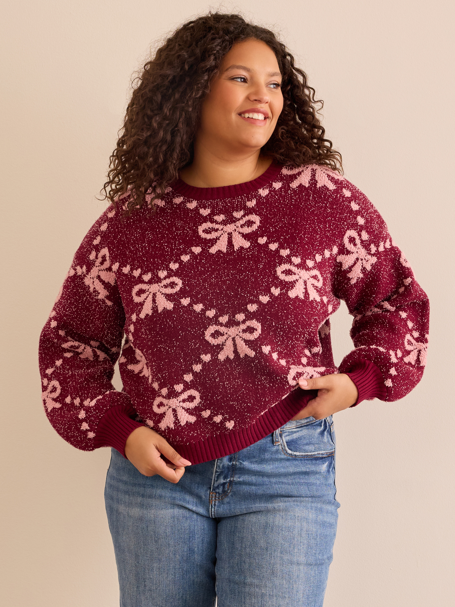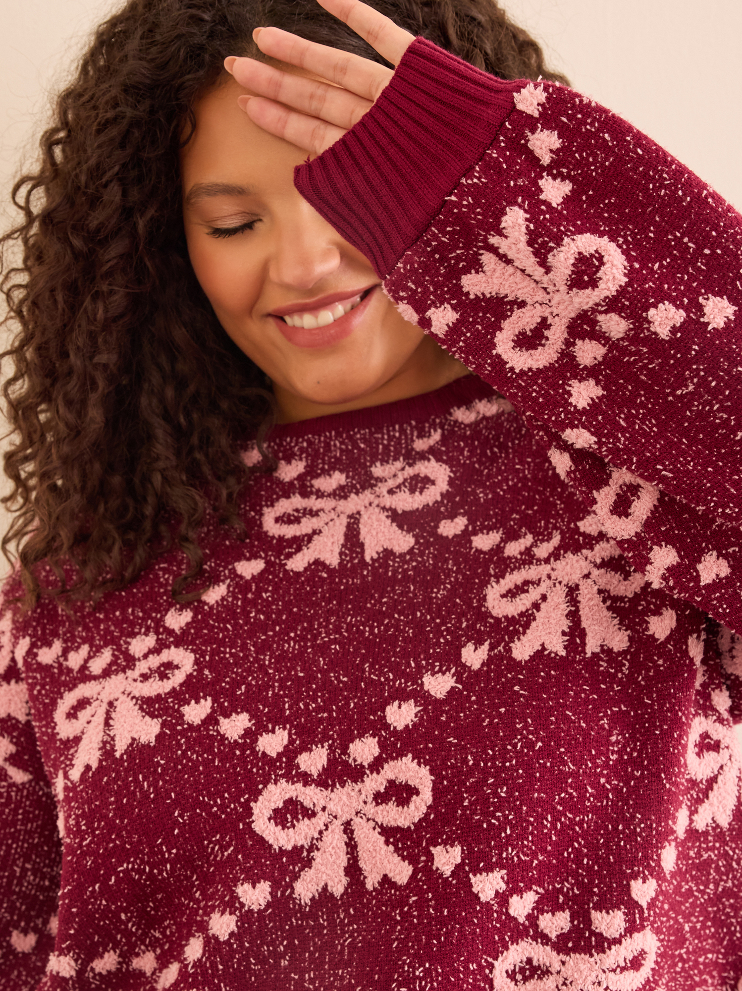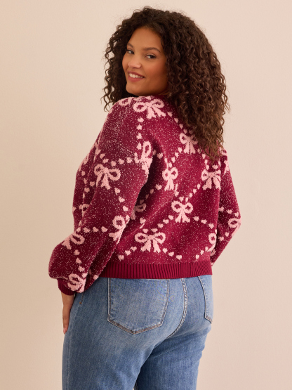 A darling bow pattern sweetens this cozy sweater knit in a cropped silhouette.