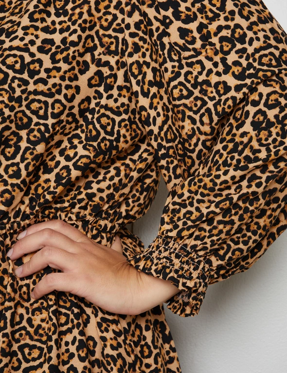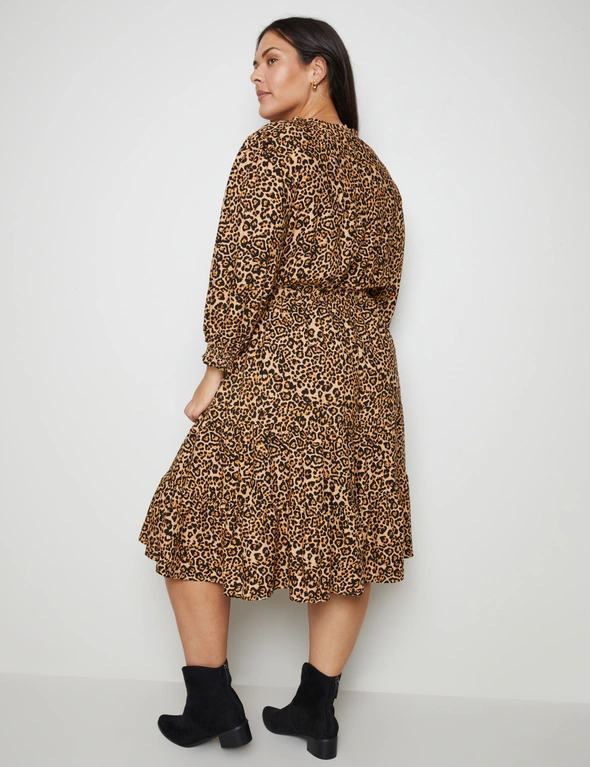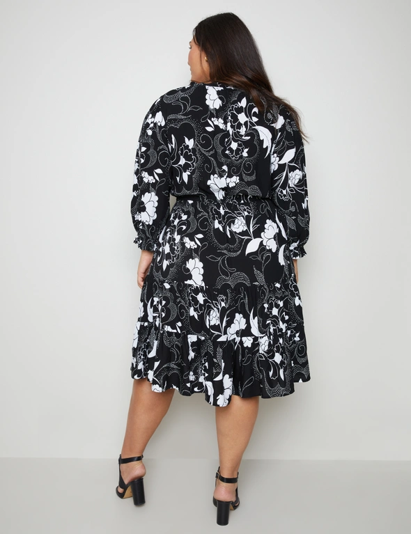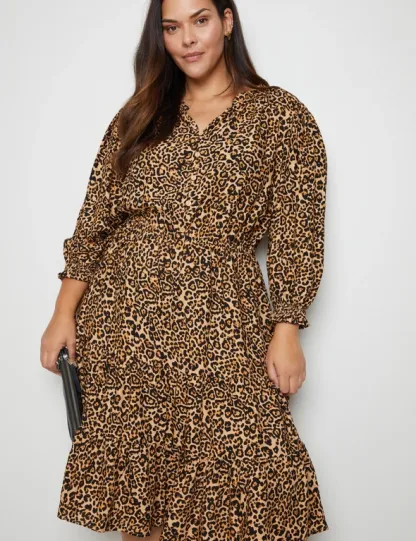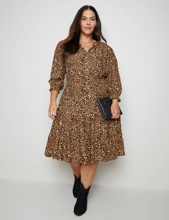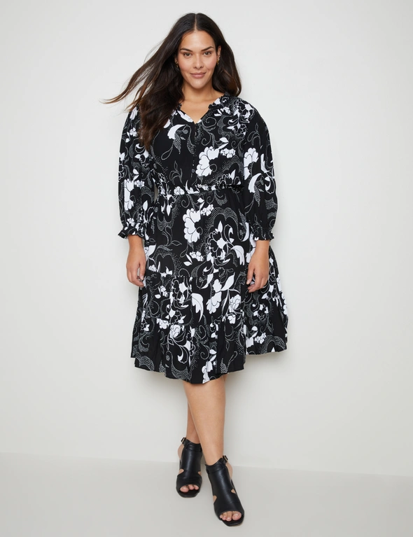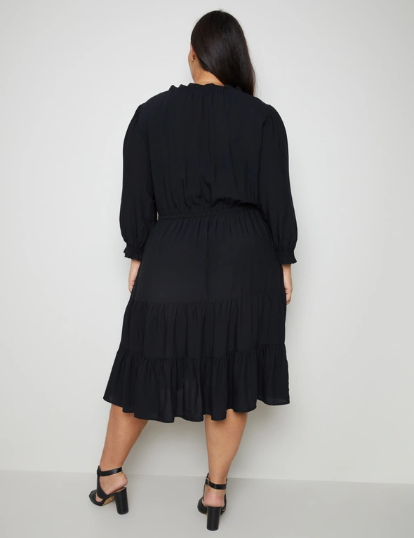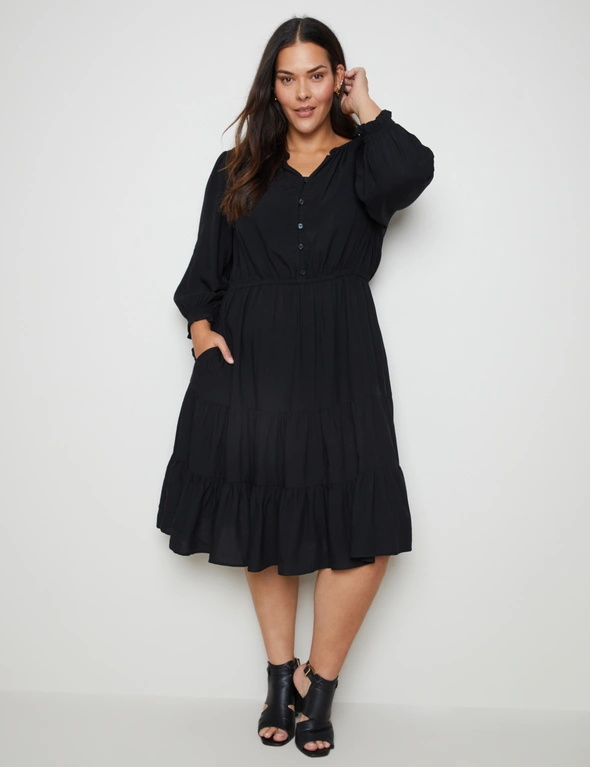 Autograph 3/4 Sleeve Notched Neck Button Tiered Midi Woven Dress