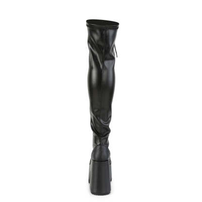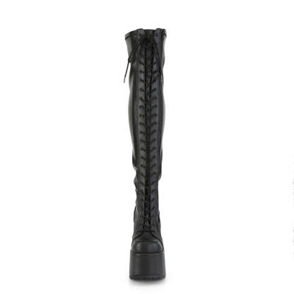 Get ready to elevate your edgy style to new heights with the Camel-300 thigh-high boot. Crafted from sleek black vegan leather, these boots feature a chunky 5" heel and a 3" platform, adding both height and comfort to your look. The full frontal lace-up design and stretch material allow for a personalized fit that hugs your figure perfectly, while also creating a sultry and enticing silhouette. In addition, the full length outside metal zip closure ensures easy on and off access, making these boots perfect for both busy nights out and leisurely strolls. With the Camel-300 thigh-high boot, you'll be able to effortlessly add an element of boldness to any outfit. So, make a statement and take your fashion to the next level with these show-stopping boots.