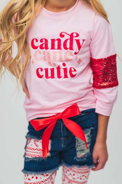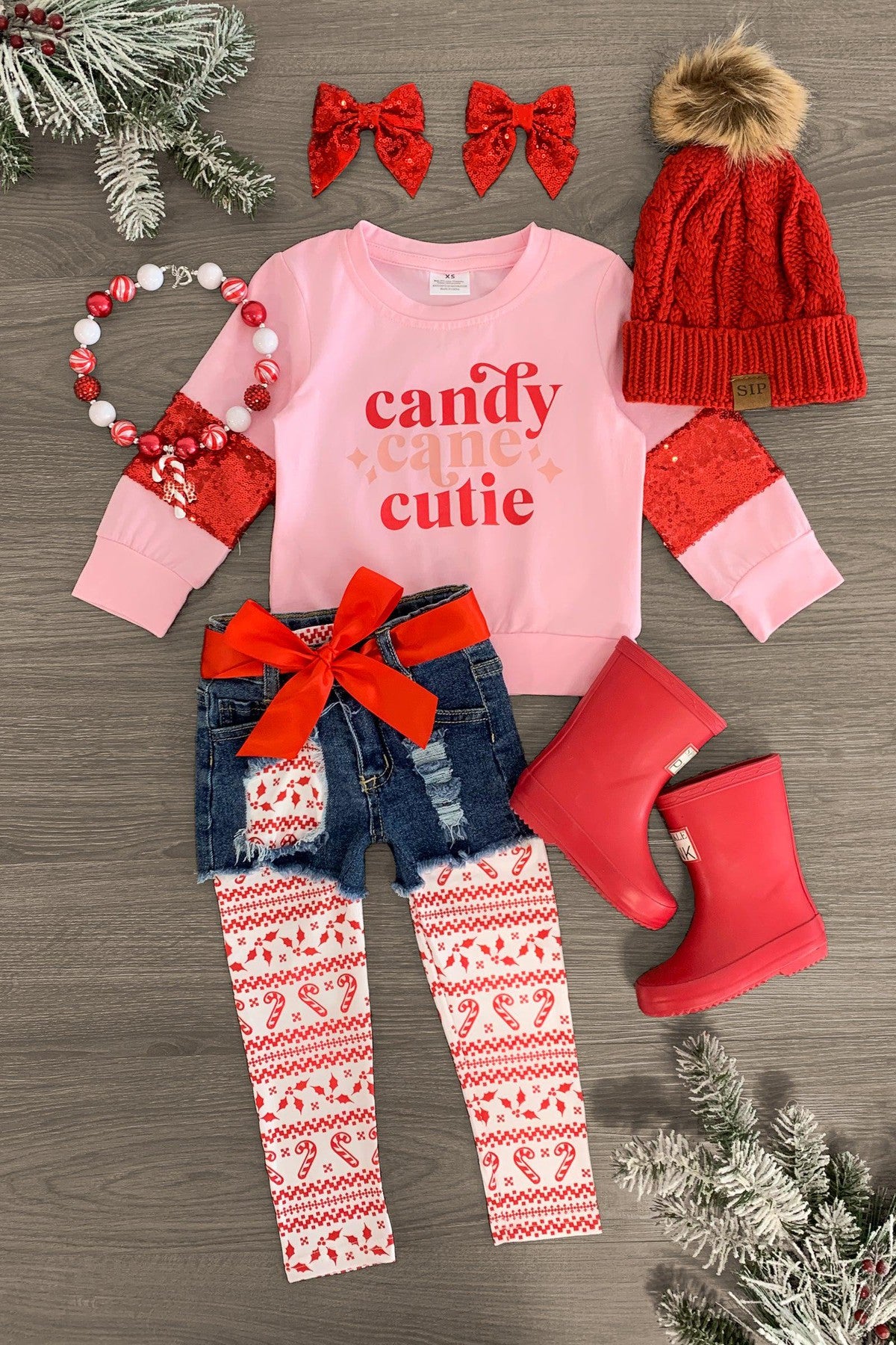 Your little one will look oh-so cute this holiday season in our "Candy Cane Cutie" Legging & Short Set. This girls' set is styled with a pink long sleeve top with red sequin detailing, making it a staple addition to her holiday wear. Paired with distressed denim shorts, matching Nordic candy cane leggings & a ribbon belt to match, the ultra-soft fabric allows her to be comfy all day long. She can pair this set with or a matching for the perfect look!