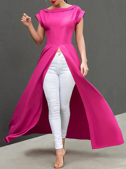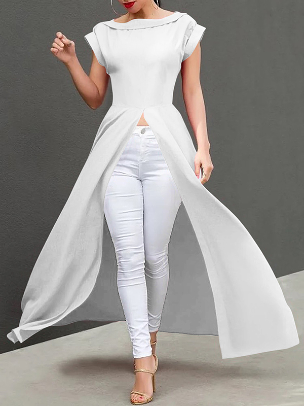 Cap Sleeve Loose Solid Color Split-Front Boat Neck T-Shirts Tops